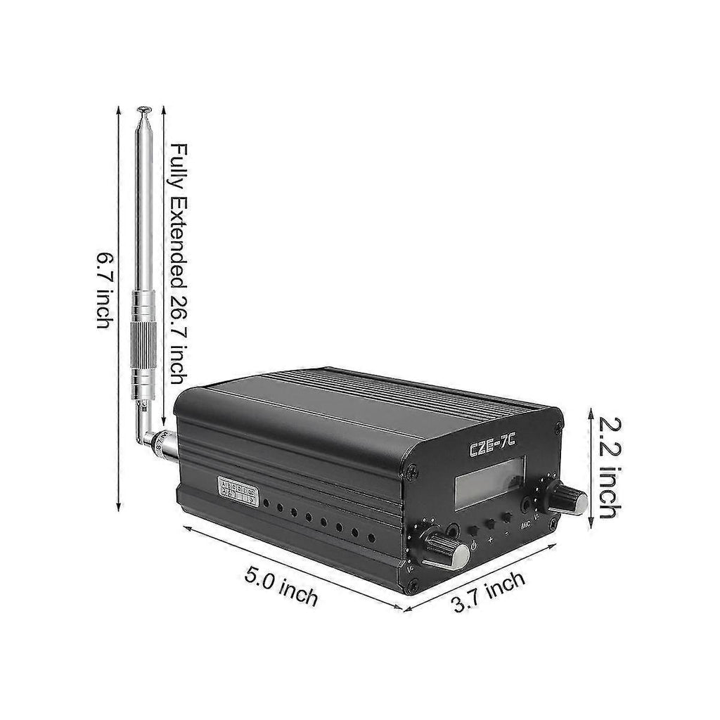 power modes 7W and frequency range 88.1-107.9MHz. High Stability with next-generation integrated NC FM stereo radio transmitter chip BH1415, built-in PLL advanced modulation system, audio pre-emphasis, limiter and low pass filter circuit. Clear Stereo Sound with AT89C2051 and AT24C02 control panel, three power amplifiers (two 2SC3355 and one 2SC2053) to great sound quality output effect. Excellent Heat Dissipation with high quality aluminum alloy material, and excellent heat dissipation. Easy to Use with LCD display to show transmission frequency, easy to adjust and intuitive. Material: aluminum alloy colour: black Package Contents: 1 x FM Transmitter With Antenna Only the above package content, other products are not included. Note: Light reflection and different displays may cause the color of the item in the picture a little different from the real thing. The measurement allowed error is +/- 1-3cm.