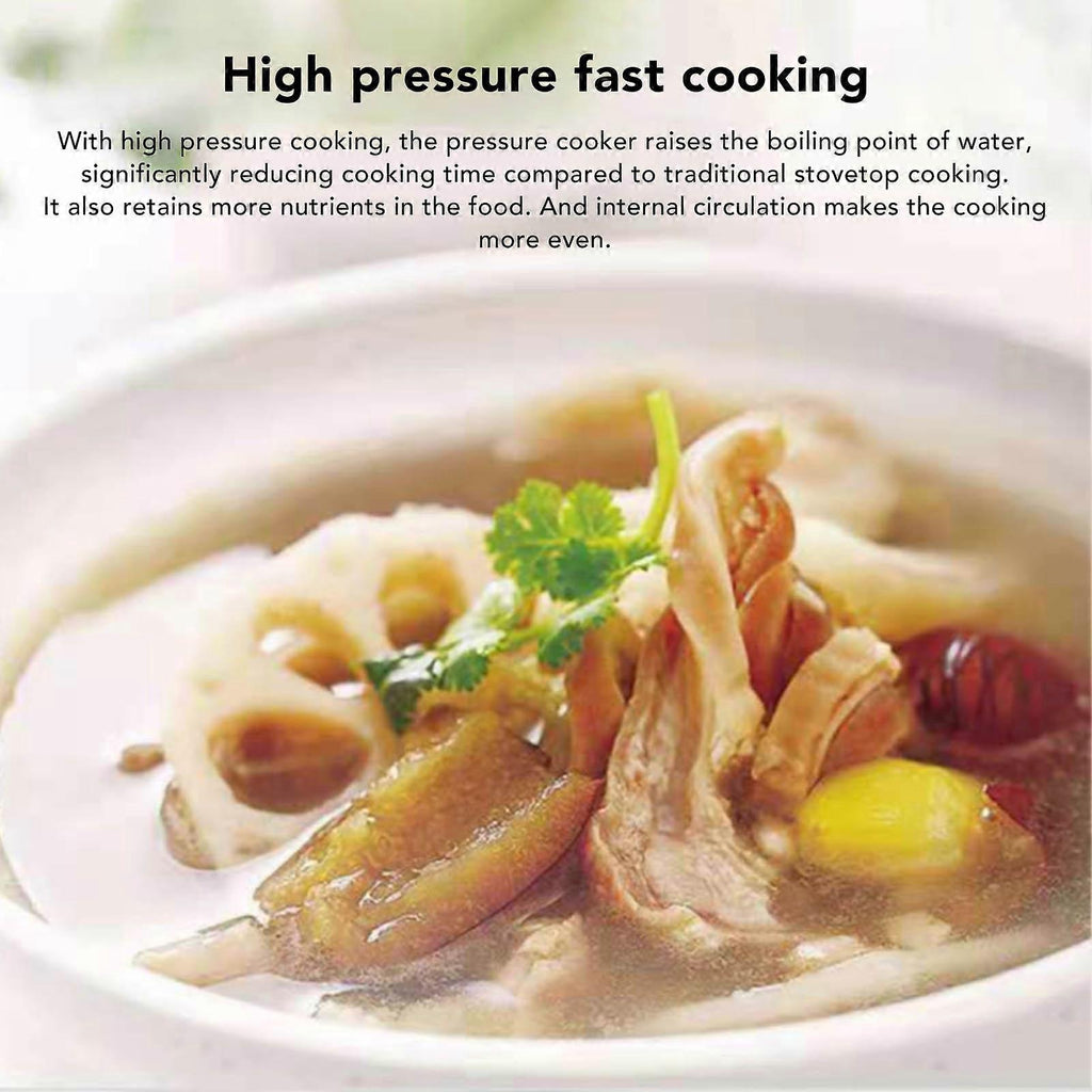 1Stainless Steel: Made with excellent materials this pressure cooker is highly heat resistant and can withstand harsh environment ensuring long lasting quality and durability. 2Efficient Cooking: With high pressure cooking the pressure cooker raises the boiling point of water significantly reducing cooking time compared to traditional stovetop cooking. It also retains more nutrients in the food. And internal circulation makes the cooking more even. 3Multi Functional Design: This pressure cooker can be used for cooking rice stewing soup steaming making porridge and boiling noodles. It offers versatile cooking options for your convenience. 4Intelligent Protection: Equipped with a safety valve and pressure limit device this high pressure cooker intelligently controls the internal pressure ensuring a safe cooking process. The pressure limit valve auto locks when the internal pressure reaches 80KPA. At this time the lid cannot be opened until the pressure lower down 80Kpa. 5Wide Compatible: The pressure cooker is compatible with both induction stovetops and gas stoves allowing for quick and efficient heat transfer. It is versatile and can be used on different types of cooktops.