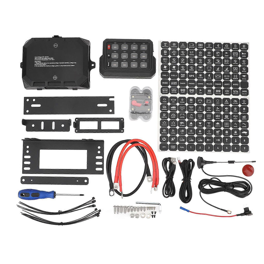 Features 1.Stylish and and Durable: The switch panel features a matte black finish with strong texture, elegant and stylish design, compact size that doesn't take up installation space. Made of plastic shell and aluminum CNC processing, high strength, impact resistance, not easily damaged. 2.Improved Performance: Spacious sides of this RGB switch panel allows rapid temperature conduction within the chamber, ensuring optimal operation with a lifespan of up to 30,000 hours, recommended for installation above the vehicle body's water immersion depth to ensure normal electrical operation. 3.Waterproof and Dust Resistant: With IP65 waterproof protection, the LED switch panel is resistant to rainwater and dust to prevent functionality loss. Background brightness automatically adjusts based on ambient light levels. 4.Versatile Application: This compact sized switch panel control system, can be installed on the dashboard, center console, overhead sun visor, etc. Ideal for various needs such as trucks, marine, SUVs, power sports, boats, ATVs, UTVs, SUVs, cars, buses, and more. 5.Easy Operation: A red button on the left of this circuit control relay system features one button system activation and deactivation, allowing quick response to emergencies. Supports wireless signal transmission up to 10 meters, can be used as a remote control to adjust and control different lighting effects. Specification Item Type: 12 Gang Switch Panel Backlight: RGB StyleLight Source Type: LEDWaterproof Rating: IP65Material: Plastic, AluminumDC Voltage: 12V/24V DCMaximum Current: 80APower: 960W/12V, 1920W/24VOperating Temperature: -40C - +85CMaximum Wireless Signal Transmission: Approx. 10m / 32.8ftFitment: Suitable for trucks, ships, off road vehicles, power sports, boats, ATVs, UTVs, SUVs, cars, buses, heavy vehiclesRGB Function: Switch: Switch with memory function, automatically remembers the last settingBacklight Brightness Adjustment: Short press, 5 levels of brightness adjustment (Full, 75%, 50%, 25%, 10%). Press once to switch to different levels of brightness.Long press, enter setup mode to choose between fastmode and strobe mode. Long press again to exit setup mode.Backlight Color Adjustment: Short press, switch between single colors (cycling from 1 to 8) 1. Red 2. Orange 3. Yellow 4. Green 5. Cyan 6. Blue 7. Purple 8. White.Long press, gradient, jump, breathe switch (cycling through 9 to 11) 9. Gradient: Red-Orange-Yellow-Green-Cyan-Blue-Purple10. Jump: Red-Orange-Yellow-Green-Cyan-Blue-Purple11. Breathe: Red-Orange-Yellow-Green-Cyan-Blue-Purple3 Lighting Modes: Steady light, fastmode, strobe mode, adjust as desired.Step 1: Long press brightness adjustment key for 1 second. When the red backlight flashes, enter fastsetting state.Step 2: Press the button you want to set (you can choose between 12 buttons in fastmode) and then press the ON/OFF button to confirm. The setting is successful at this time.Step 3: Press the ON/OFF button again to exit setup mode.Strobe Mode Setting: Step 1: Long press brightness adjustment key for 1 second, red backlight flashes. (note: this is the fast setting state, please refer to specific steps) Step 2: Then short press brightness adjustment key, when blue backlight flashes, enter strobe setting state.Step 3: Press the button you want to set (strobe mode can be selected from 12 buttons), and then press the ON/OFF button to confirm, then the setting is successful.Step 4: Press the ON/OFF button again to exit setup mode. Package List 1 x Panel1 x Circuit Board1 x Reset Switch10 x Cable Ties1 x User Manual7 x Wire Harnesses5 x Brackets2 x Functional Stickers1 x Installation Tool1 x Patch1x Accessories Package (23PCS)