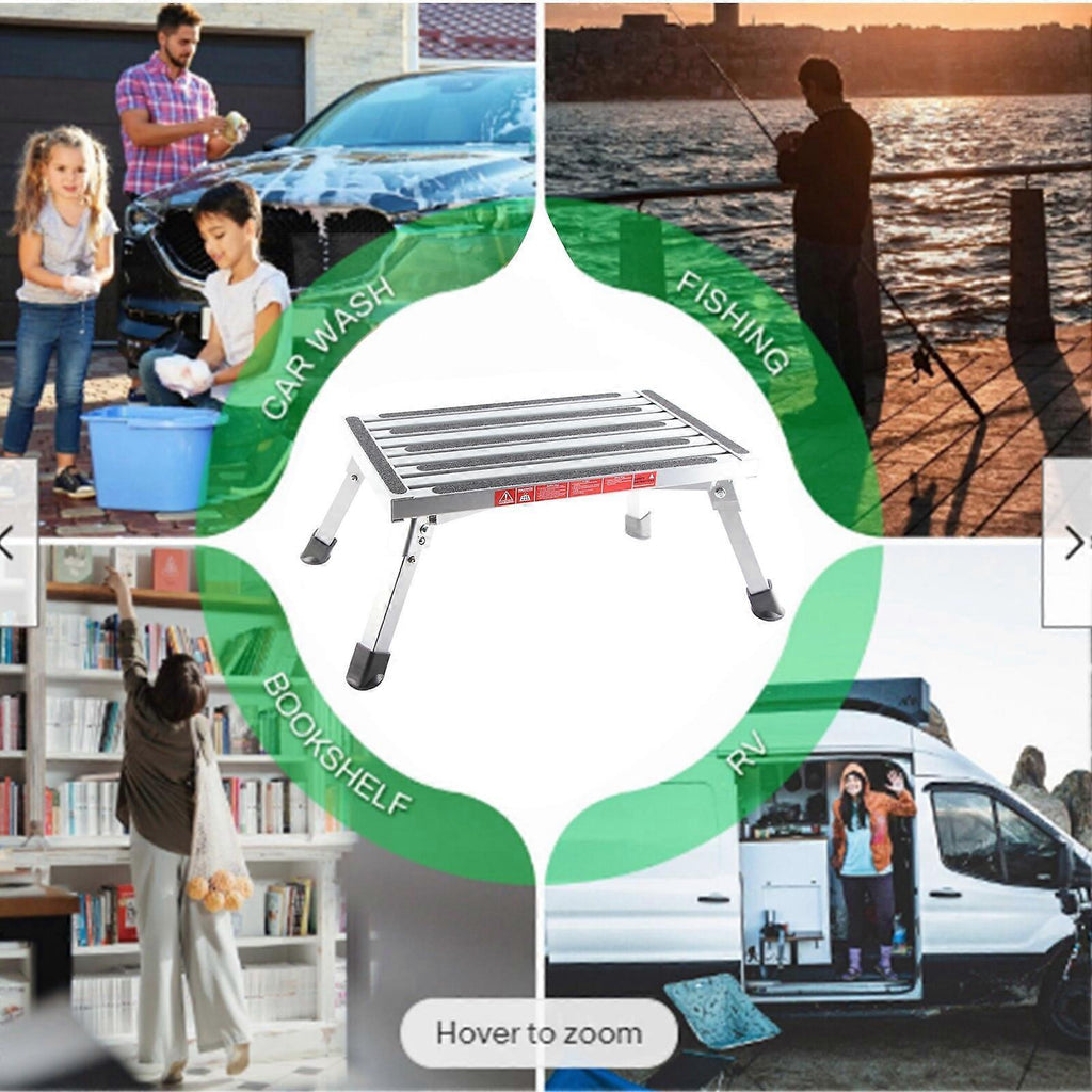 Features: 1.FOLDABLE: Foldable when not in use, it can be stored in almost any small gaps without taking up storage space. It folds down flat making it compact and ideal for storage in your RV. 2.RUBBER FEET: The thickened rubber ladder feet has strong grip and stability, and is also very convenient to use, effectively improving its safety. 3.STABLE: It can hold up to 440lb and meet the needs of most people, providing the necessary stability for a safe and secure step up into your RV, trailer. 4.MATERIAL: The rust proof durable RV step stool has a non slip strip on the surface, which can effectively prevent accidental slipping, built to last with aluminum alloy construction 5.APPLICATION: The step stool is perfect for both indoor and outdoor use. In addition to suitable for RV, SUV, camping, fishing, etc, multi functional step stool can also meet the children in the bathroom, kitchen use. Specification: Item Type: RV Step Stool Material: Aluminium alloy Color: Silver Gray Platform size: Approx. 47 x 30cm / 18.5in x 11.81in Load bearing capacity: 440lb Suitable for RV, trailers, trucks