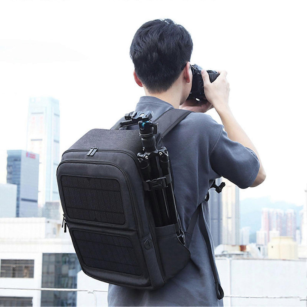 Features 1Solar Power: The solar panel absorbs solar energy, efficiently converting it into electricity to charge your smartphone or other small devices. When your phone is low on battery, you can use the USB connection on the backpack. 2Large Capacity: This backpack is a great companion for outdoor activities, with enough room to accommodate your 14 inch laptop, camera, clothing, food, water bottle, small utensils, magazines, tablets, smartphone, sunglasses, umbrella, sanitary napkins, lipstick, and other cosmetics. It can also carry a digital SLR camera body, 36 additional lenses, and accessories. 3Waterproof Oxford Cloth Material: Water resistance to keep anything inside from getting wet. Equipped with durable metal zippers and a comfortable handle, this backpack reduces pressure on your arms when holding it. 4Sturdy Shoulder Straps: The breathable elastic shoulder straps and back provide additional back support, ensuring a comfortable feeling. 5Solar Charger Backpack: Enjoy free unlimited on the go power with solar charger backpack, perfect choice for any outdoor enthusiast. Perfect for photography, backpacking, trekking, mountaineering, fishing or biking. Specification Item Type: Solar BackpackMaterial: Oxford ClothWeight: Approx. 1171g / 41.3ozSolar Panel: ETFE Lamination TechnologyConversion Efficiency: 24%Max Power: 12WUSB Max Output: 5V 2.1A Package List 1 x Solar Backpack2 x Compartments Note Without power storage function.