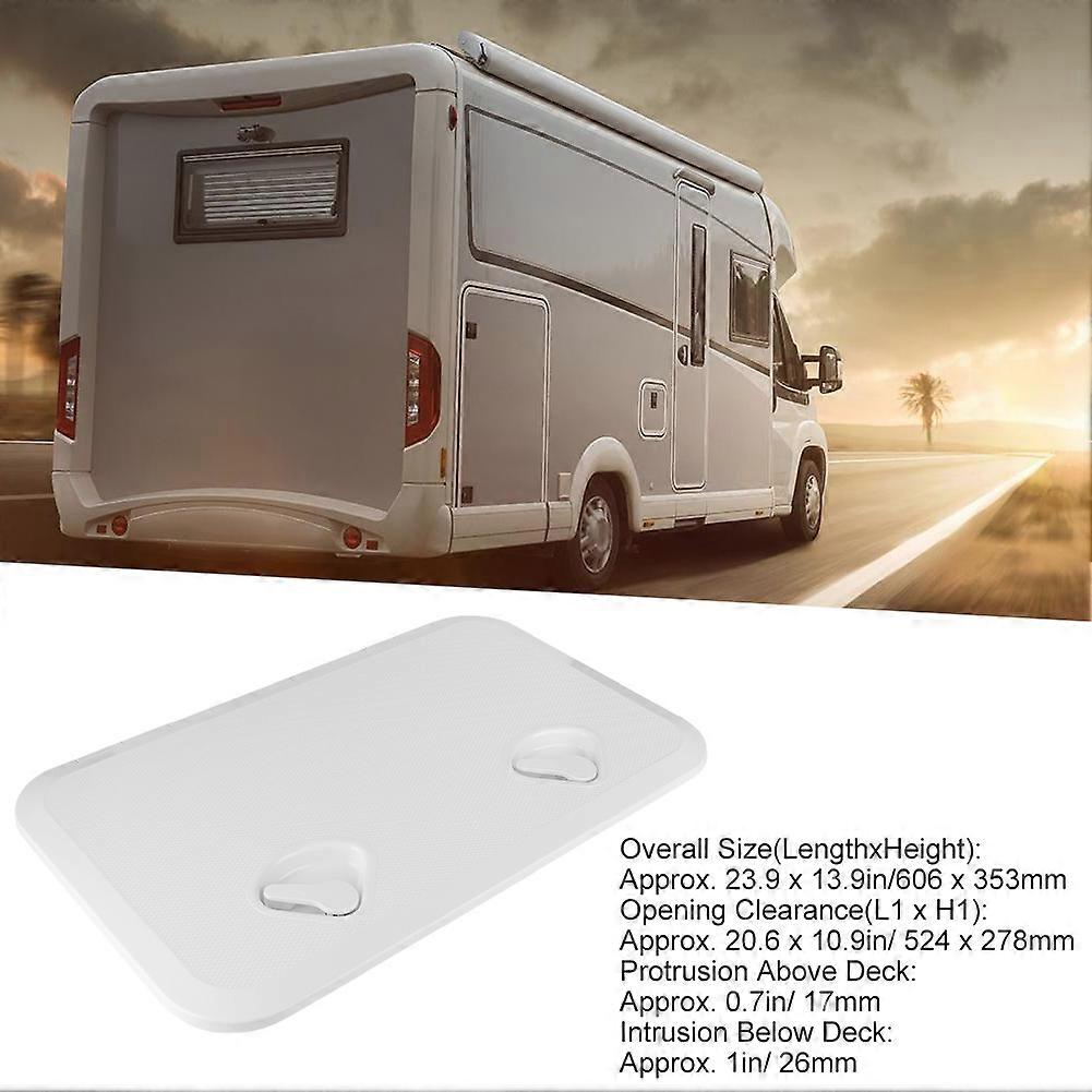 Features: 1.Heavy duty, UV stabilized white ABS construction, long durability. 2.Low profiles hatch, designed for installation on internal or external flat surface. 3.Reinforced lid with non-skid surface, dependable to use. 4.The lid hinges 180 and completely covers the mounting flange, for an attractive flush finish. 5.Rubber seals ensures weatherproofing when mounted on vertical surfaces. 6.Supplied with 2 strong recessed handle, making it convenient for using. 7.Simple to install, pre-drilled countersunk fastening holes (screws not included). Specification: Condition: Item Type: Deck Access Cover Material: ABS Color: As picture shown OEM: RE-353-606 Overall Size(LengthxHeight): Approx. 23.9 x 13.9in/606 x 353mm Opening Clearance(L1 x H1): Approx. 20.6 x 10.9in/ 524 x 278mm Protrusion Above Deck: Approx. 0.7in/ 17mm Intrusion Below Deck: Approx. 1in/ 26mm Mounting screws not included PackageList: 1 x Deck Access Cover Note: Please double check the part number of your item, matching information is for reference only. If you are unsure of the item, please contact us before buying to avoid unnecessary return, thanks!