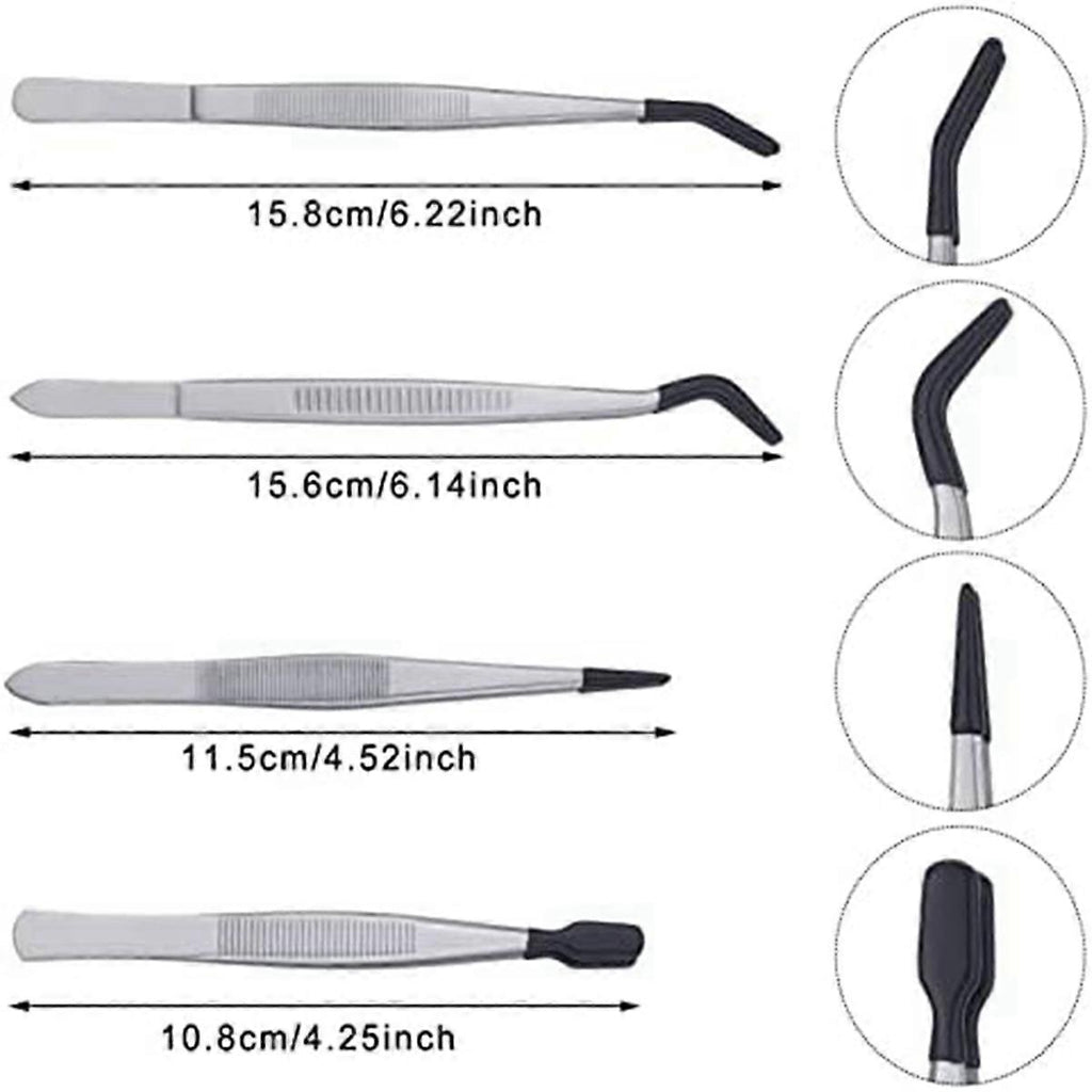 You receive 4 different kinds of tweezers tips in the package, enough kinds to meet your needs in . Rubber-coated design: these bent tweezers adopt a rubber-coated retaining tip design, which is not easy to slip or move, giving you a soft grip without scratching or breaking delicate targets, improving the quality and efficiency of your work. Material information: these curved tweezers are made of stainless steel, not easy to break, deform, fade or rust, the coating of the tweezers' head is made of rubber, which is not easy to fall off, featuring nice elasticity without too soft, serviceable and reliable to use. Wide applications: these bent tip tweezers are of nice workmanship and simple to operate, can be applied for purposes, such as processing jewelry and handicrafts, clip chips and other small parts and so on, a variety of uses waiting to discover. color:Silver Material:Stainless steel Package Contents: 20 x Straight Tip Tweezers(about 12cm) 20 x Flat Tip Tweezer 40 x Long Bent Tweezers(about 15cm) Only the above package content, other products are not included. Note: Light reflection and different displays may cause the color of the item in the picture a little different from the real thing. The measurement allowed error is +/- 1-3cm.