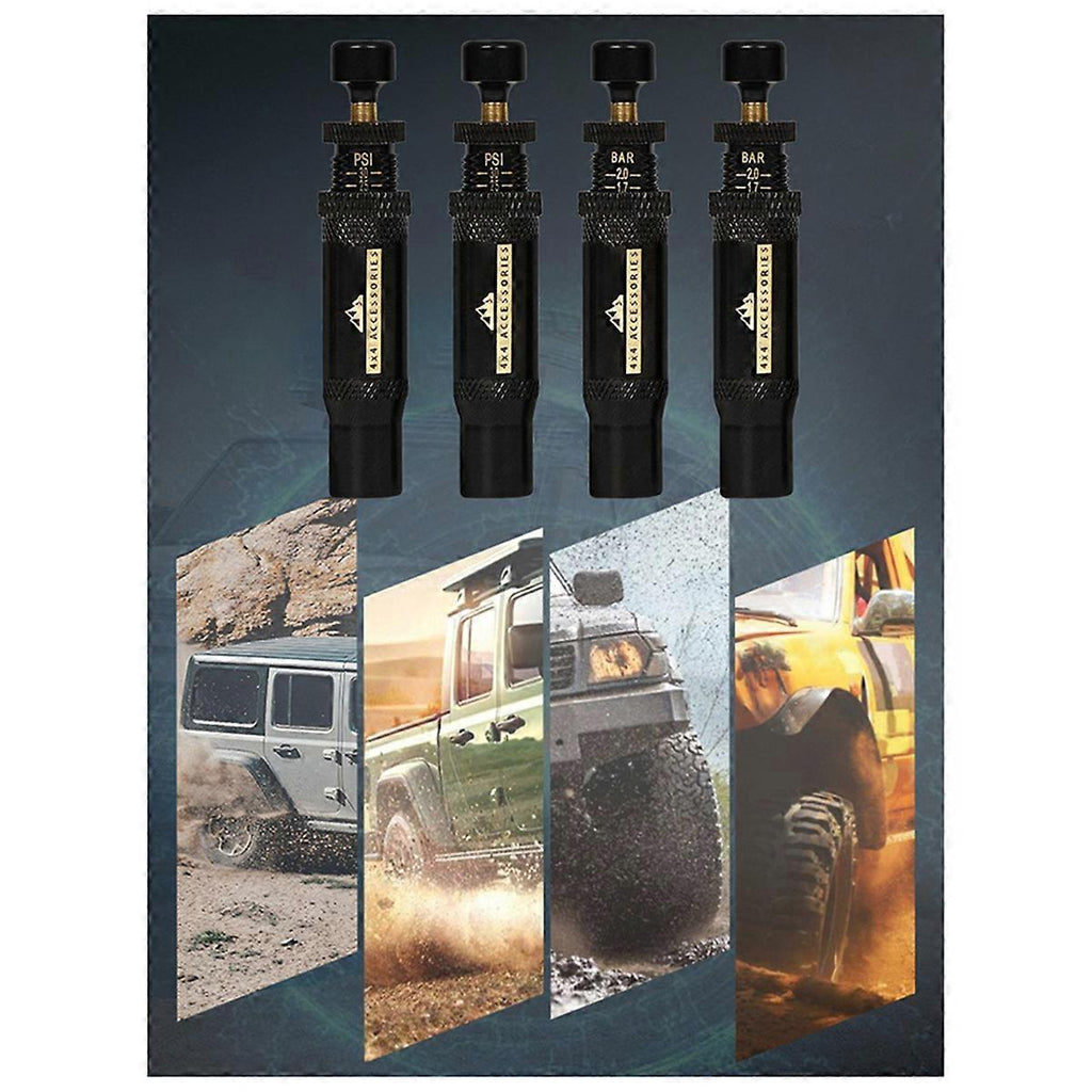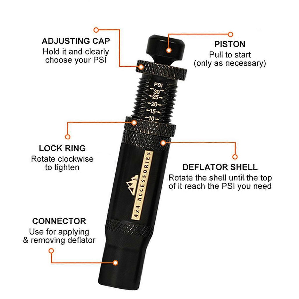 : This kit allows you to Air Down tires in short period and you do not have to wait and keep an eye on tire pressure. The Deflator Valve automatically stop at your pre-set PSI value. ACCURACY: Each is individually Calibrated, yet +/- 2 PSI is considered acceptable. The deflator kit is designed for quick off road air down set up, but not for accurate vehicle tuning. ADJUSTABLE: No Tools are required. The come with Clear Scale Display, adjust the desired Air Pressure and it stop letting air out when the PSI value has been reached., simply by twist the Deflator Shell. Adjustable Range from 30PSI to 10PSI. HIGH ACCURACY: The with scale display, as you can see clearly with PSI you need, and is easy to set. COMPACT: The set of 12 deflators fit easily the palm of your hand with the included a bag to store, air down all four tires in just a few minutes. It be a Tire Air Down Tool for your car, motorcycle, truck, bike, SUV, RV or ATV. Size: 58mm high, hole diameter 7mm Colour:As Shown Material:Metal Package Contents: 3 set x Adjustable Auto-Stop Valve Kit Only the above package content, other products are not included. Note: Light reflection and different displays may cause the color of the item in the picture a little different from the real thing. The measurement allowed error is +/- 1-3cm.
