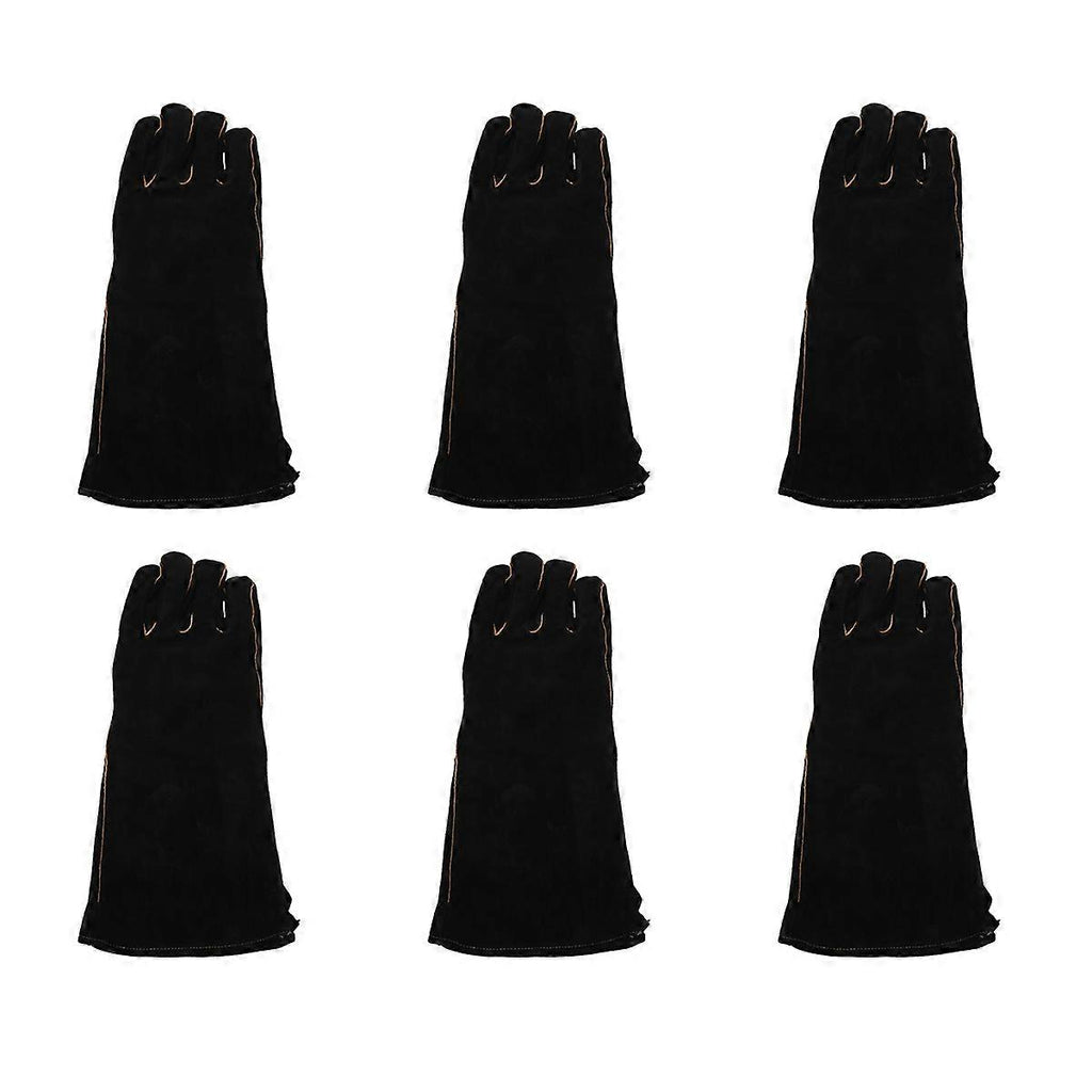 EXTREME HEAT PROTECTION:Full cow split leather (which made from carefully high-quality cow leather with thickness depth above 1.2mm),heat insulation,fireproof and soft sweat absorbent cotton inside,denim cuffs,that make these gloves to withstand temperatures at least 662??F(350??C)and enough to handle most of the high-temperature work. THICK AND SOFT:These gloves are made from specific parts of the cow,which is not only thick but also soft and flexible with extreme heat/fire resistance and puncture resistance,cut resistance and moderate oil resistance.So it can effectively improve your work efficiency. PPTA STITCHING:The gloves uses PPTA thread,that means it more to high temperatures than other heat gloves and not easy to break,very suitable for high-temperature work.Reinforced palm to cushion hands when working with heavy weight or objects.Excellent performance in heavy duty welding,gripping hot stuff such as stove&cookware&burning coal or firewood. WIDE RANGE APPLICATION:This glove features and excellent quality useful for Welding,Grill,Barbecue,Wood Stove,Oven,Fireplace,Cutting,Gardening,Camping,Campfire,Animal Handling,welders and so much more. Size: 40cm/16 inch Colour: Black Material: labor insurance cloth Package Contents: 6 pair Barbecue gloves Only the above package content, other products are not included. Note: Light reflection and different displays may cause the color of the item in the picture a little different from the real thing. The measurement allowed error is +/- 1-3cm.