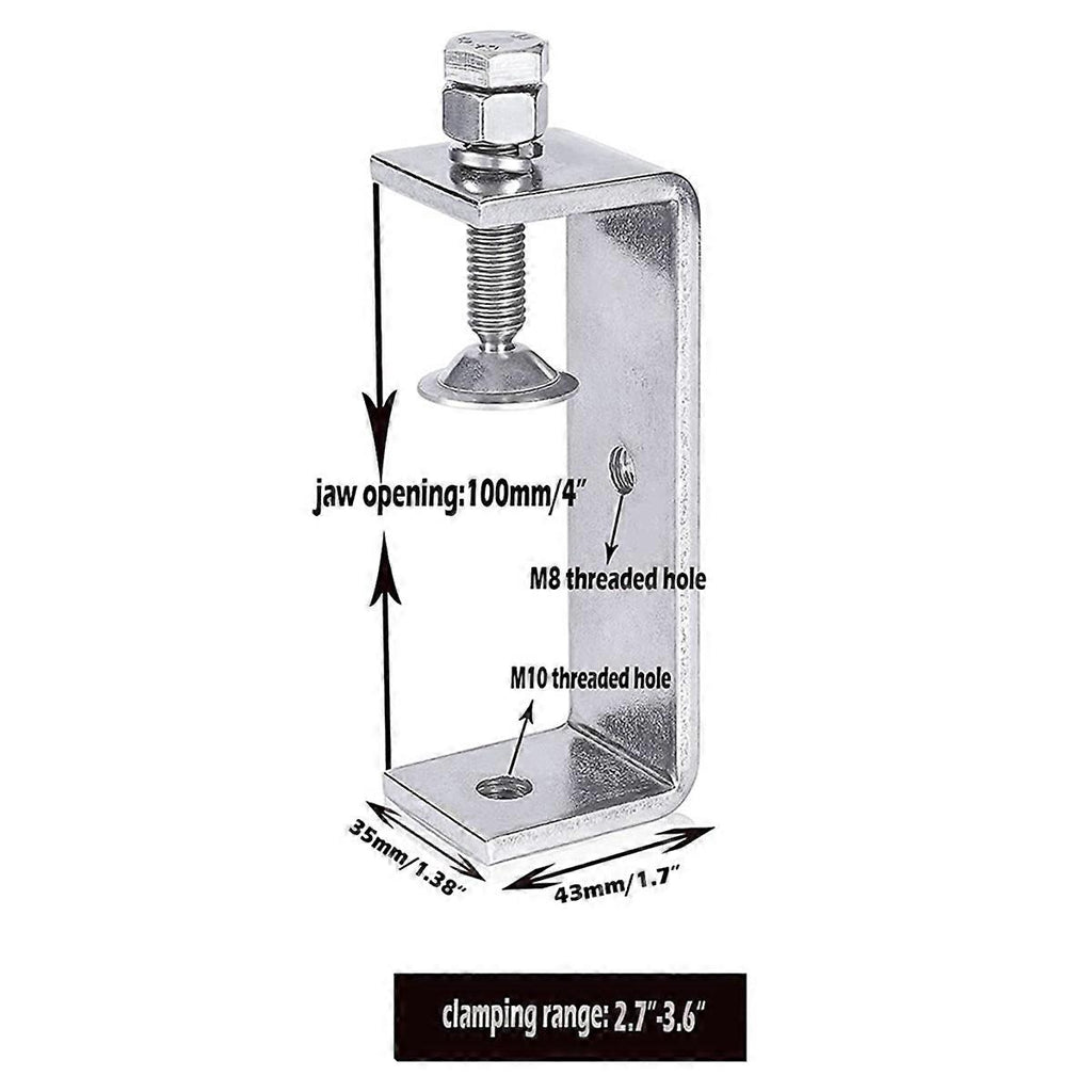 With one M10 threaded hole and one M8 threaded hole. The thread on the screw allows it to slide smoothly without stuck or stuck.The thread on the screw allows it to slide smoothly without stuck or stuck. Heavy duty C-clip: The C-clip is made of high-quality stainless steel with a coating on the , which is , rust , and sturdy. The I-beam design provides a certain degree of strength, ensuring that the object is firmly grasped without deformation. [ Wide application range ] The C-type fixture has powerful functions and a wide range of applications, and can fix parts for assembly, fastening, bonding, and welding. Widely used in furniture manufacturing, metal processing, as well as home and automotive applications, this reliable metal C-clip ensures that everything is in the correct position. [Convenient to use] The clamp has adjustable set screws, which can be adjusted as needed. It can be easily clamped on any table top and wooden plank, with strong clamping force and convenient use. size: 100MM Material: Stainless steel colour: silver Package Contents: 12 x c clamps Only the above package content, other products are not included. Note: Light reflection and different displays may cause the color of the item in the picture a little different from the real thing. The measurement allowed error is +/- 1-3cm.
