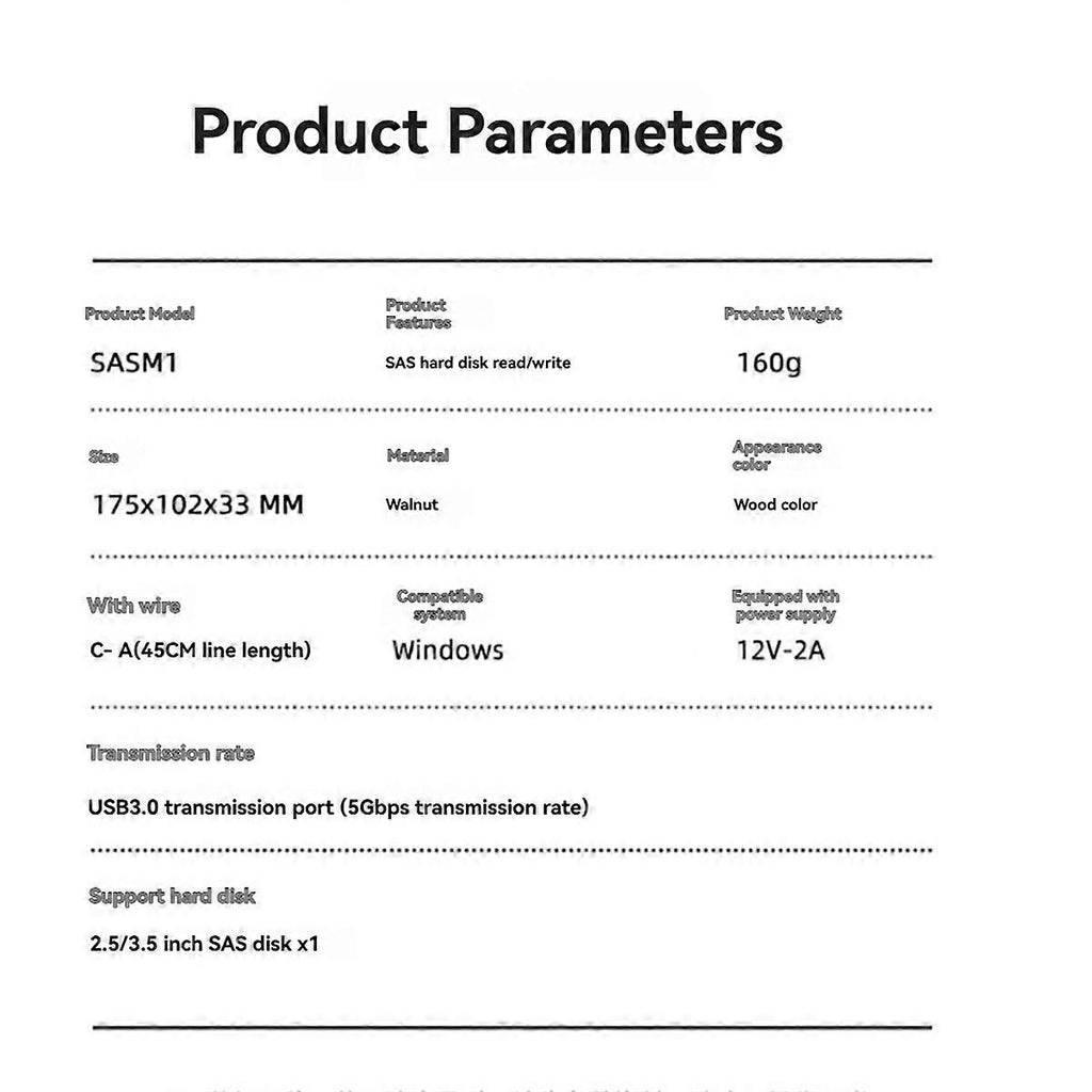 High speed reading and writing,Type-C 5Gbps transmission bandwidth plug and play,Type to USB3.0 transmission cable design, this is a walnut wood hard drive box Compatible with 2.5/3.5 inch SAS Hdd/Ssd Hard Drive Product features:SAS hard drive reading and writing Size:175x102x33 MM Matching wire:C-A (45CM cable length) Product weight:160g Compatible systems:For /For Linux/For OS Transmission rate:USB3.0 transmission port (5Gbps transmission rate) Support hard disk:2.5/3.5-inch SAS disk x1 power adper:12V-2A The product appearance and printed words depending on the batch, but this does not affect use. Plug Type:EU Plug,it applies to Indonesia, Germany, France, Spain, Italy and so on. Voltage:AC100-240V Colour:As Shown Material:walnut Package Contents: 1 * External Hard Drive Enclosure Only the above package content, other products are not included. Note: Light reflection and different displays may cause the color of the item in the picture a little different from the real thing. The measurement allowed error is +/- 1-3cm.