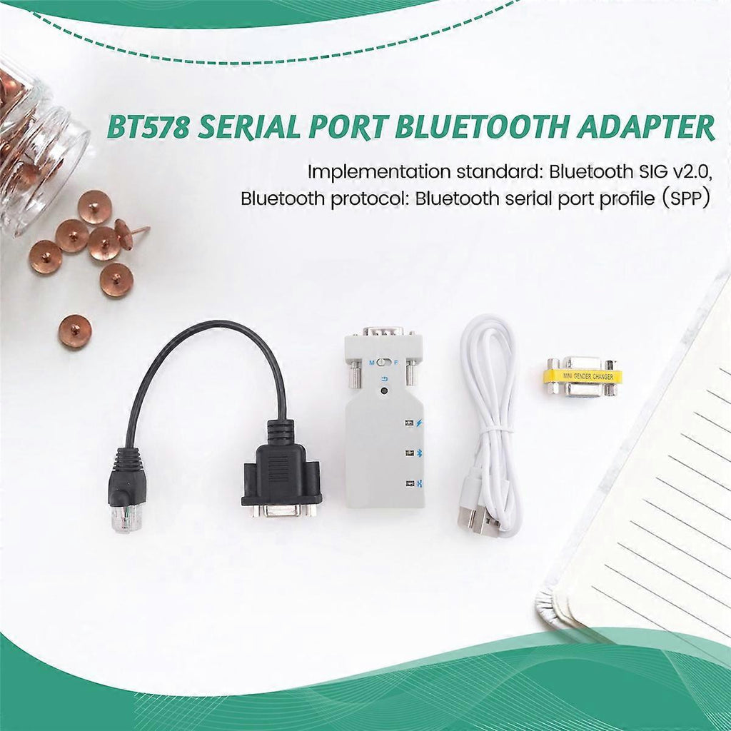 Implementation standard: Bluetooth v2.0, Bluetooth protocol: Bluetooth serial port profile (SPP) Communication rate: 4800, 9600, 19200, 38400, 57600, 115200bps Modulation mode: 2.4G direct sequence frequency hopping (FHSS) Communication distance: 5 meters (open space) Transmit power: 3dBm Acceptance sensitivity: -80dBm Working current/pairing current: 8/25mA Dimensions and weight: 78x34x16mm 29g Battery usage: 1-2 hours for full charge, 8-10 hours for full use Colour:black white Material:plastic Package Contents: 2 x BT578 serial port Bluetooth adapter 2 x DB9 female to female adapter 2 x 410mAh lithium battery (built-in) 2 x 220V-USB power adapter 2 x USB power supply charging cable Only the above package content, other products are not included. Note: Light reflection and different displays may cause the color of the item in the picture a little different from the real thing. The measurement allowed error is +/- 1-3cm.