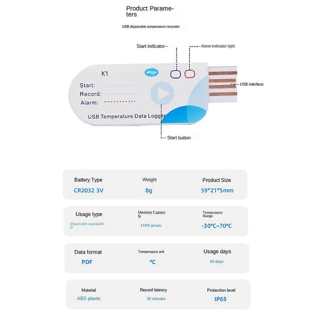 No cable or reader required, the USB connector enables quick connection to PCs to download data. The USB temperature data logger is super quick and easy to configure data logger, NO need to install any software. This temperature and humidity logger provides all key information for recordings incl. alarm status, temperatures statistics and etc. Up to 14400 temperature points and 14400 humidity points. Disposable USB temperature recorder is a simple and portable temperature recorder specially designed for cold chain.This product is widely used to monitor the transportation and storage process of food, medicine and chemical products. Battery type: CR2032(INCLUD) Material: plastic colour: white Package Contents: 20 x USB Temperature Data Logger Only the above package content, other products are not included. Note: Light reflection and different displays may cause the color of the item in the picture a little different from the real thing. The measurement allowed error is +/- 1-3cm.