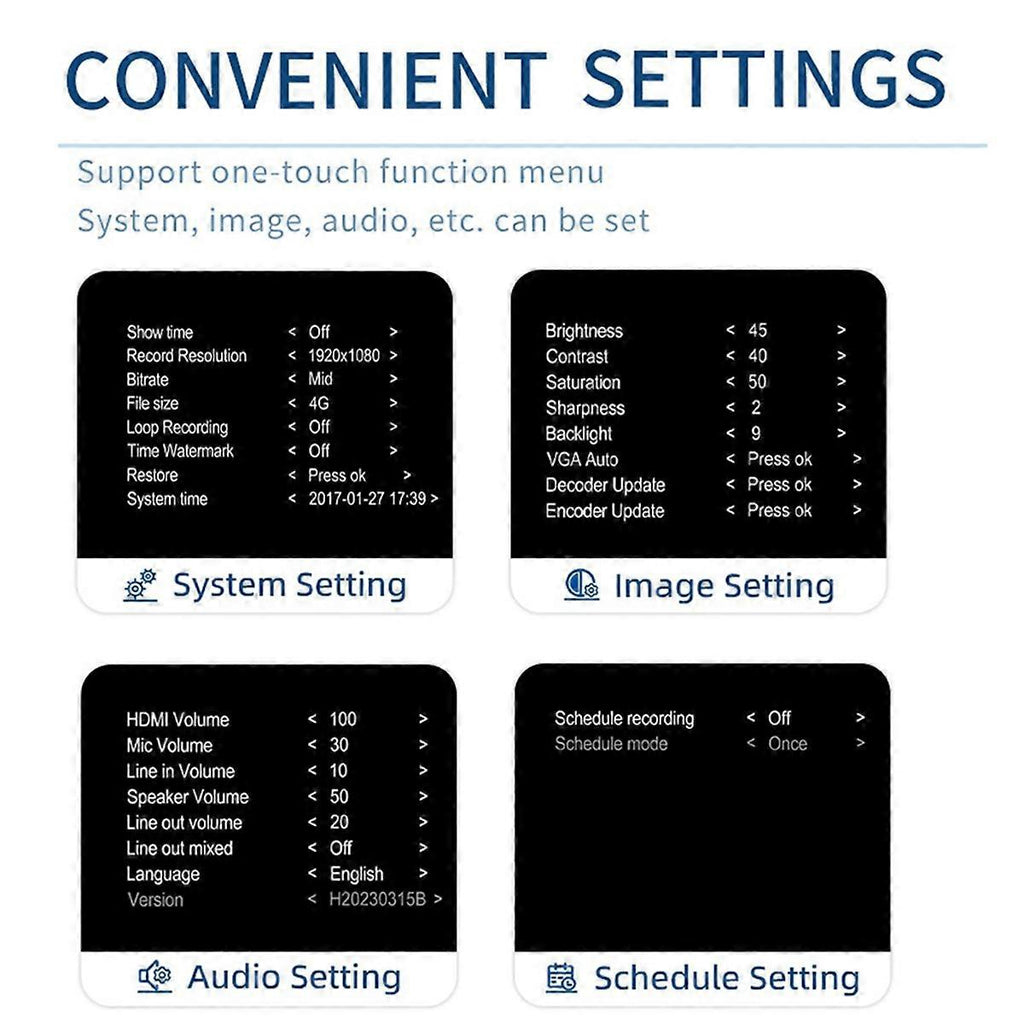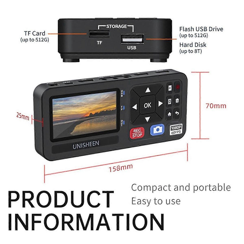 -compatible/VGA/YPbPr/CVBS video input, -compatible 1080p loop-out Recording resolution 720p/1080p, Scheduled recording, Screenshot during recording U disk/TF card/mobile hard disk. Video playback. remote control Video Input(Switchable):1xHDMI,1xVGA,1xCVBS,1xYPbPr Video Resolution:4096x2160p60,1920x1080@60P/50p,1920x1080@60i/50i/1280x720@60p/50p 720x576i/720x480i Loop Out:1xHDMI-compatible(1080p) Audio:-compatible/ Audio/External Line In Display Screen:3 Inch Remote Control:Yes Screeshot in Recording:Yes Playback:Yes Alone Mode: Record Resolution:1920x1080/1280x720/1280x1024/1024x768 Storage Device:Flash USB Drive(up to 512G),Harddisk(up to 8T),SD(up to 512G) Storage File System:FAT32/exFAT/NTFS Record Format:MP4(264 Codec) Video Bitrate:Low 4MB/Mid 10MB/High 18MB Audio Bitrate:128KB Size of Each File:4G(FAT32) or 16G(NTFS/exFAT) Schedule Recording:Support Computer Mode: Record Resolution:1920x1080/1280x720/1280x1024/1024x768 Compatible UVC/:Yes Comatible System:Win10/for OS/Linux Compatibility with 3rd application software:for OBS/Xsplit/Wirecast/FLME//VLC/Potplayer/Skype General arameter: Language:English/Chinese/Janpanese/Italian Temperature:0-55(Work),-20-80(Storage) Power/Consumption:12V DC 1.0A/5w Plug Type:US Plug,it applies to Canada,India,Mexico,Thailand,Taiwan,the ,the Philippines and so on. Voltage:AC100-240V Colour:Black Material:ABS+Metal Size:158x70x25mm Package Contents: 1 * Capture Card Box 1 * MMC Cable 1 * -compatible Cable 1.2M 1 * USB Cable 0.8M 1 * Power Adapter 12V1A 1 * Remote Control(2 AAA batteries not included) 1 * English instruction manual Only the above package content, other products are not included. Note: Light reflection and different displays may cause the color of the item in the picture a little different from the real thing. The measurement allowed error is +/- 1-3cm.