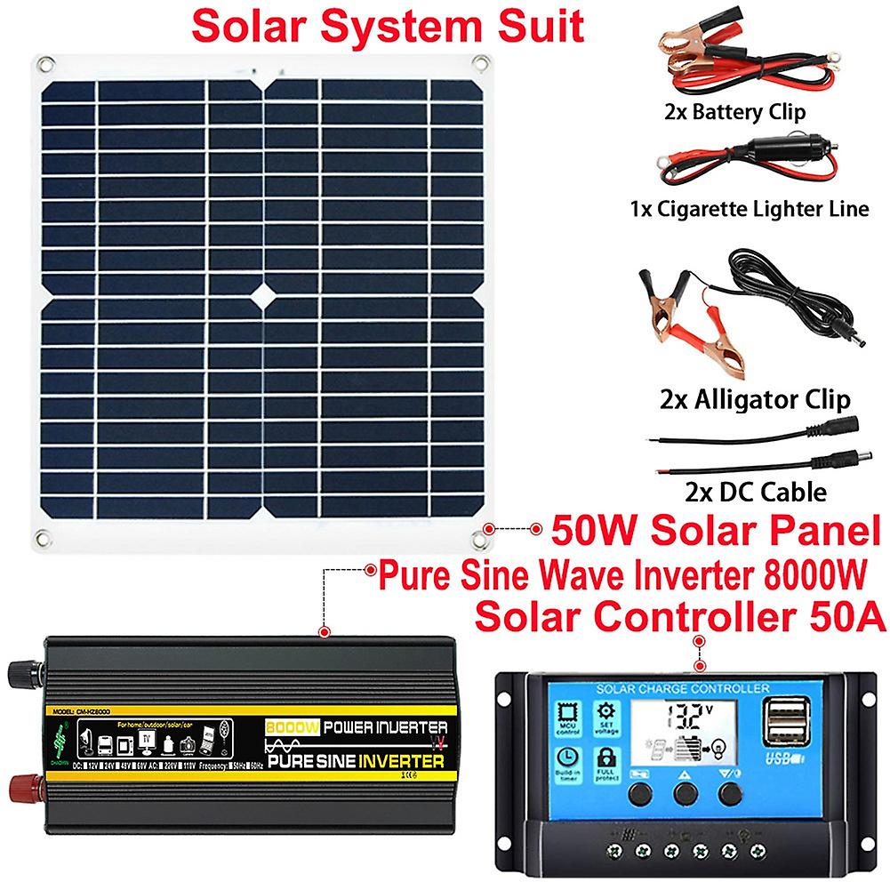 USB voltage regulator: USB 5V, maximum 3A output, can charge mobile phones, mobile power, GPS, lights and other electronic devices. The problem of outdoor power shortage. lighter: car battery charger, car battery is insufficient and unable to the problem.Alligator clip: the cost of the 12V battery, to supplement the extra electricitySuitable for outdoor, camping, hiking, climbing, traveling, fishing, desert . Waterproof design, IP65 grade, light and portable, easy to carry.[Pure Sine Wave] Converts 12V DC to AC 220V household wall power with continuous 1300Watts output ( 8000Watts surge capability) with 1 AC receptacles, one LED Voltage display, high current DC terminals and two LED work lights. ( make that the rated power of the connected devices is 1300W).Specification:Name: Monocrystalline Solar PanelMaximum power: 50WMaximum power voltage: 18VMaximum power current: 1.12AOpen circuit voltage: 20VShort circuit current: 1.5APower Inverter 1300W/8000WSpecifications:Name: Pure sine wave power inverterInput voltage: DC 12V for car (9.8~15V)Output voltage : AC 220V (210~230V)Output frequency: 50Hz/60HZPeaks Power : 8000WRated power: 1300W ( make that the rated power of the connected devices is 1300W ) power: 2600WContinuous power: 1300WMaximum Active Surge Rating (less than 1 second) :8000WMaximum AC Current per socket :8.33AmpereOutput Waveform: True/pure sine wave ( Less than 3% )Efficiency: 90%No Load Current Draw (DC side) Less than 0.6 AProtection: overload, over temperature, high pressure, low pressure, reverse connection and short circuit intelligent temperature control, less than 1300WMaterial: Aluminum+Plastic+Monocrystallinecolour: As shownPackage Contents:1 x inverter1 pair x red and black battery clips1 x lighter1 x solar controller1 x solar panel2 x DC cables1 pair x DC alligator clipsOnly the above package content, other products are not included.Note: Light reflection and different displays may cause the color of the item in the a little different from the real thing. The measurement allowed error is +/- 1-3cm.