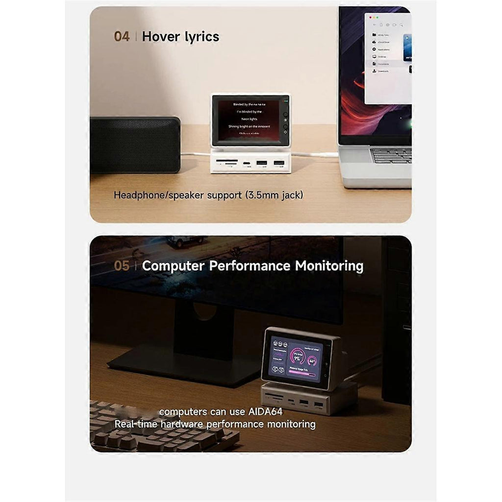 Mini secondary screen 3.5-inch IPS screen The IPS screen has a viewing angle, up to 178 viewing angle. Different viewing angles, the same accurate color presentation Multi-port docking station meets a of expansion needs. It has rich interfaces and can be connected to external devices such as keyboard, mouse, USB flash drive, mobile hard disk, mobile phone, SD/TF flash memory card, etc 2 connection modes, both laptop/desktop can be used Small computer secondary screen docking station combines retro aesthetics with modern technology Brightness adjustment screen switch Product Name: Mini PC Monitor + Docking Station Color: White Material: Abs Screen Size:3.5 Inches Resolution:960x640 Aspect Ratio:3:2 Fully Functional Cord Length: 1m Applicable: Notebook/Desktop, Etc Package Contents: 1 * Mini PC Monitor 1 * Silicone Pad 1 * Fully Functional Cable 1 * Instructions in Chinese and English Only the above package content, other products are not included. Note: Light reflection and different displays may cause the color of the item in the picture a little different from the real thing. The measurement allowed error is +/- 1-3cm.