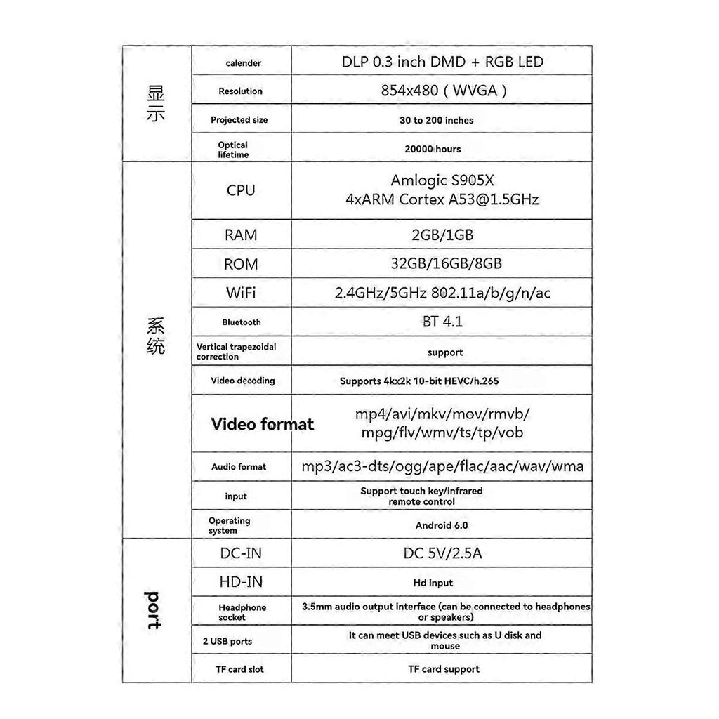 Built-in Battery: 4000mAh 3.7V 14.8Wh Extended Storage: Support TF Card and Hard Disk Remote Control: Support(IR) Infrared and 2.4G wireless control Video Support(up to 4k): VP9-10,265,264,MPEG-4,WMV/-1,MPEG-2,MPEG-1,RealVideo 8/9/10 etc. Audio Support: MP3,WMA,MP2,OGG,AAC,M4A,MA4,FLAC,APE,3GP,WAV Android 9.0 OS WiFi: 2.4G & 5G BT: BT 4.2 Basic Frequency:Quad Core ARM -A55 CPU GPU:ARM Mali-G31 MP2 GPU Memory: 8GB Light : Up to 20,000 hours Brightness: 65 Lumens Contrast Ratio: 500:1 Resolution: WVGA 854*480 Project Dimension: 30-120 inch Speaker: one 1W speaker Projection Mode: Front/ Rear/ Ceiling front/ Ceiling rear Correction: Vertical 40 degree,Horizontal 45 degree,Multi angle adjustment The product appearance and printed words depending on the batch, but this does not affect use. Plug Type:US Plug, it applies to Canada, India, Mexico, Thailand, Taiwan, the , the Philippines and so on. Voltage:AC110V Colour:As Shown Material:ABS Package Contents: 1 * mini projector 1 * adapter Only the above package content, other products are not included. Note: Light reflection and different displays may cause the color of the item in the picture a little different from the real thing. The measurement allowed error is +/- 1-3cm.