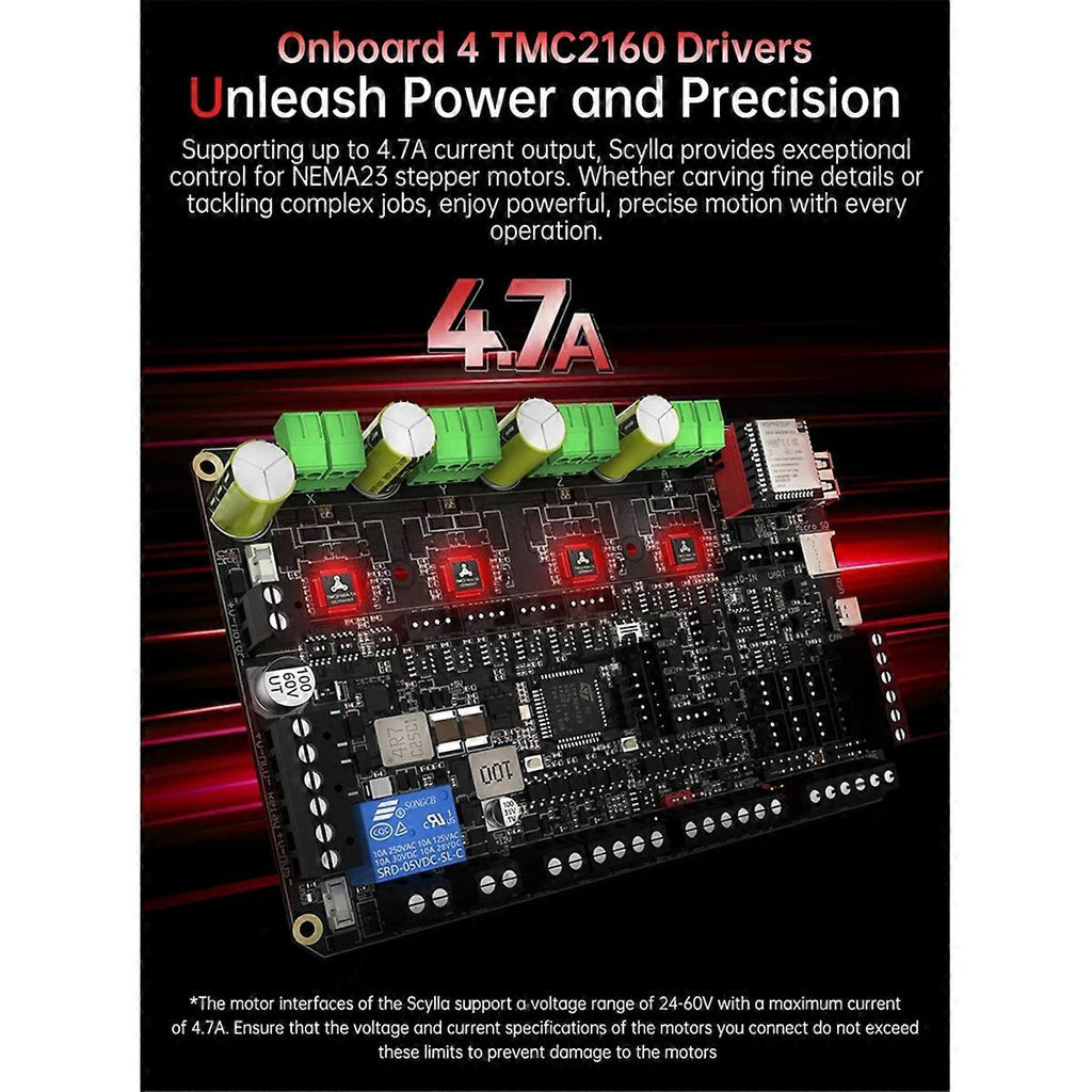 ARM -M7 STM32H723VGT6:Blazing-fast,550MHz. Onboard 4 TMC2160 Drivers:4.7A Current, smooth NEMA23 Motor Control. PWM/RS485:Dual Control Modes. RepRap:Supports RRF Firmware. Wi-Fi:Remote Control. All-metal Integrated Heatsink:Beat the heat. ESD-Protected:USB Port. Reverse Connection . DC24V-DC60V:Wide Voltage Input. Signal Isolation:Optocouplers/Isolation Chips. MCU:32-bit ARM -M7 STM32H723VGT6 550MHz Memory Interface:mic-SD Card Input Voltage:V-Motor: DC24V-DC60V 10A; V-MCU: DC24V-DC60V 3A V-MOS: DC24V-DC60V 10A Logic Voltage:MCU and ESP32: 3.3V; Other Chips: DC 5V Driver Current:: 6.7A, Effective Value: 4.7A DCDC 5V Output:6A, 7A () DCDC 12V Output:1.5A, 2A () Driving Mode:4x TMC2160 in SPI mode, supports DIAG function Stepper Motor Interface:X, Y, Z, A Communication Interfaces:USB Type-C, RS485, CAN, ESP32 Endstop Interfaces:8 Pcs (X-MIN, Y-MIN, Z-MIN, A-MIN, X-MAX, Y-MAX, Z-MAX, A-MAX) PWM Output Interfaces:AUX0, AUX1, AUX2, MIST, COOL Spindle Interface: Signal Input Interface:IO-IN Detection Signal Input Interface:Probe, TOOL Expansion Interfaces:SPI, I2C, UART, Relay NOTE: The motor interfaces of the support a voltage range of 24-60V with a maximum current of 4.7A. that the voltage and current specifications of the motors you connect do not exceed these limits to prevent damage to the motors. Colour:Black Material:PCB+Components Package Contents: 1 x motherboard 1 x USB cable 1 x XH2.54 connection cable 1 x Heatsink 1 x crimping terminal set 5 x black jumper caps 10 x red jumper caps Only the above package content, other products are not included. Note: Light reflection and different displays may cause the color of the item in the picture a little different from the real thing. The measurement allowed error is +/- 1-3cm.