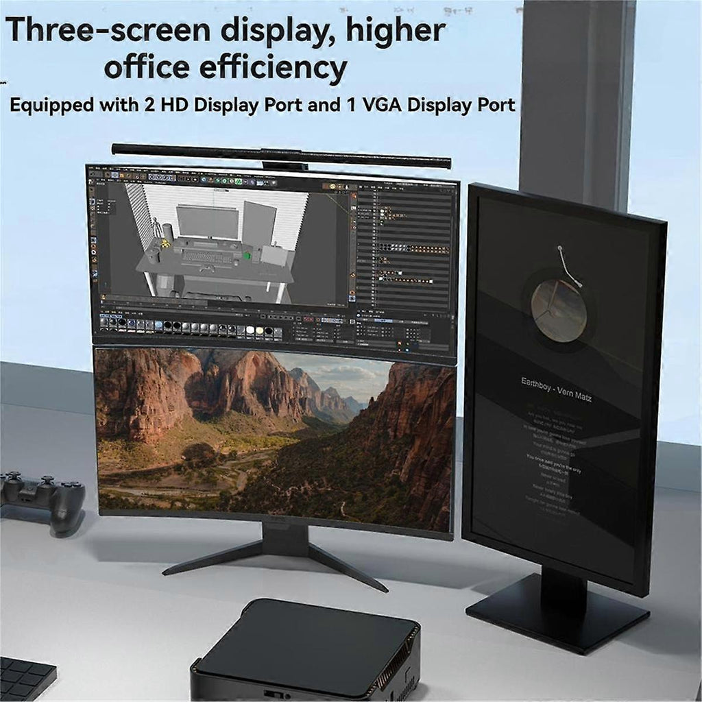 [NEW CPU] This mini PC delivers a performance boost of 35% in CPU and 78% in GPU over previous models, ensuring smooth multitasking and efficient handling of professional tasks like photo editing. [Expansive Memory & Storage] Equipped with 8GB DDR4 RAM and a 256GB M.2 2280 SSD, this mini PC offers rapid data access and ample storage. [Compact and Versatile Design] Mount it behind a monitor with for a seamless "" setup, or place it under a TV for enhanced entertainment options, making it ideal for both work and play. [Stunning 4K Graphics] Enjoy breathtaking visuals on up to three screens. Whether it's professional graphic design, video playback, or casual web surfing, the delivers vibrant images and clear text. [Robust Connectivity Options] This mini PC supports Gigabit Ethernet, dual-band WiFi,and Bluetooth 4.2/5.2, offering versatile connectivity for all your devices. It's equipped with dual HD ports for multi-monitor setups and a built-in cooling fan to optimal performance during intensive use. Graphics Card Description:Integrated Memory Storage Capacity:256 GB Specific Uses For Product:Multimedia, Server, Personal Computer, Business Computer, Office PCetc display type:4K HD@60 :OS Personal computer design type:Mini PC Plug Type:US Plug, it applies to Canada, India, Mexico, Thailand, Taiwan, the , the Philippines and so on. Voltage:AC100-240V Colour:Black Material:Metal Package Contents: 1 * host 1 * charger 1 * cable 1 * base 1 * Multi-language instruction manual Only above package content, other products are not included. Note: Light reflection and different displays may cause color of item in picture a little different from real thing. The measurement allowed error is +/- 1-3cm.