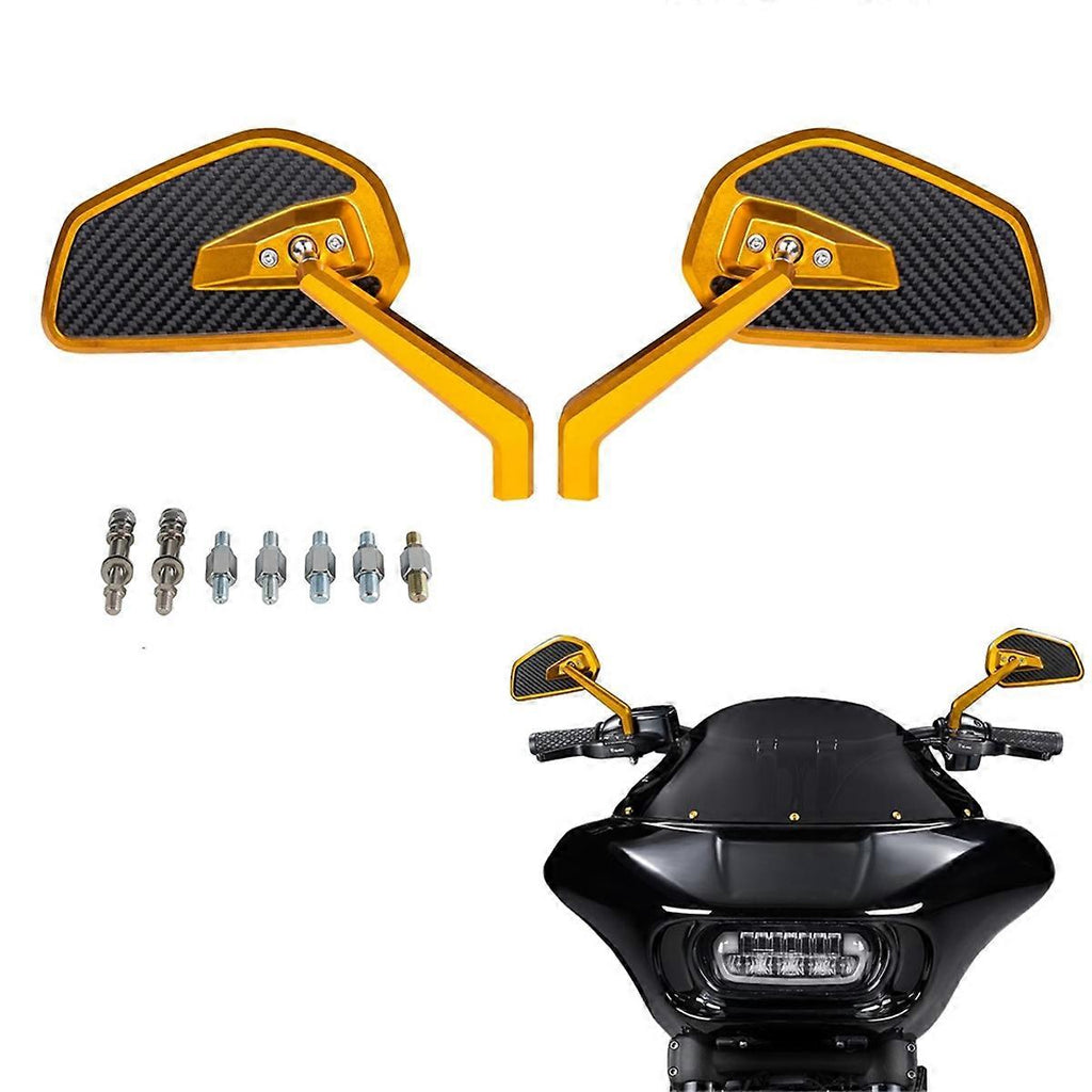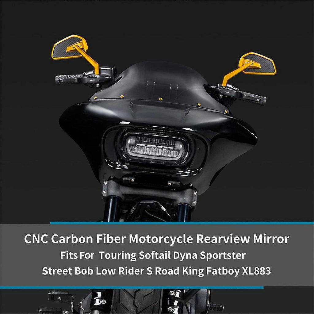 Compatibility: The motorcycle review mirror fits for Touring, Softail, Dyna, , Street , Low S, , Fat Boy, and XL883. In addition, our rearview mirrors come with multiple adapters, making them compatible with various motorcycle and models. Premium Materials: Made from high-quality aluminum alloy and a specially formulated carbon fiber composite, offering excellent strength and durability. The motorcycle mirrors utilize a unique carbon fiber blend, providing superior impact resistance and long-lasting performance. Design: Featuring an ultra-thin profile of approximately 11mm, these motorcycle review mirrors are about 40% lighter compared to all-aluminum , delivering a more agile and responsive riding experience. Unique Design: With a distinctive aesthetic and precision machining, these review mirrors add a personalized touch to your motorcycle's appearance. The wide and clear convex lenses provide an expansive rear view, significantly enhancing riding safety. Compatible with for '21 later Revolution Max engine-equipped models, Pan America, etc. 5/16 inch: Compatible for '82-later models for . (except XG street models). Compatible for R18 series models. Colour:Gold Material:aluminum Due to different batches, there may be differences in product appearance and printed text, which not affect use Package Contents: 2 x Motorcycle Rear View Mirror Only the above package content, other products are not included. Note: Light reflection and different displays may cause the color of the item in the picture a little different from the real thing. The measurement allowed error is +/- 1-3cm.