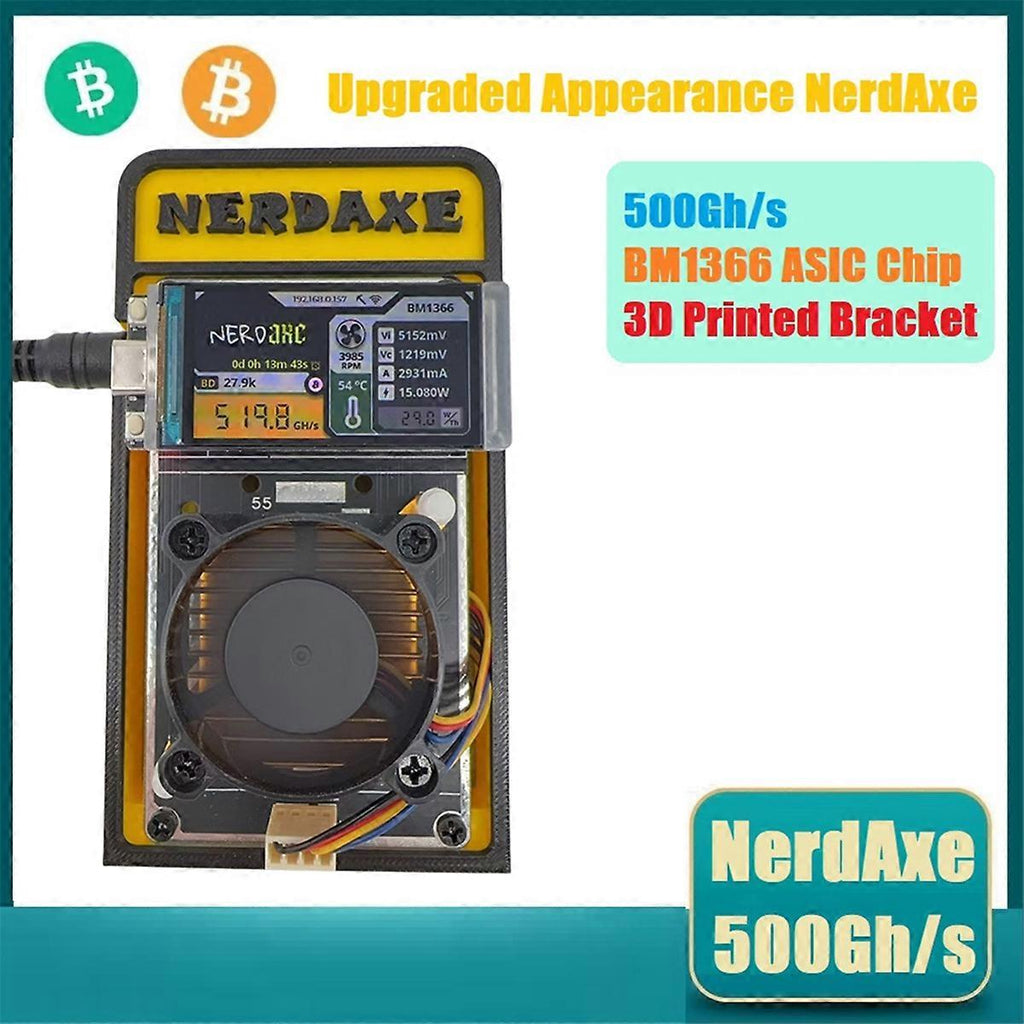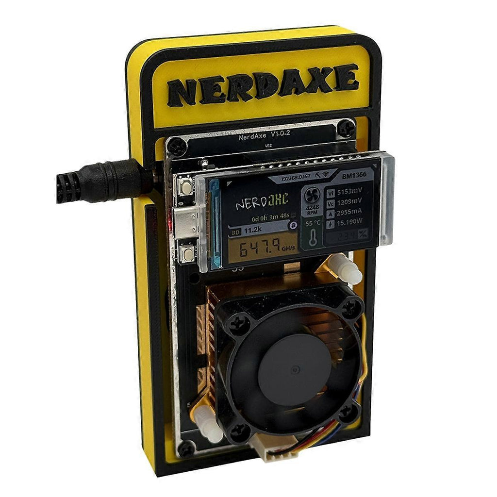 Pay special attention! ! ! ! ! ! This device has been written with the 2.1.4 stable version firmware. You can only use the 2.1.4 firmware we have installed. It is strictly forbidden to flash other versions of firmware! ! ! Otherwise, it cause device failure. If the failure is caused by this reason, our store not bear the consequences. It has been strictly tested before delivery When you get the device, you only need to set Wi-Fi and your wallet address, and the mining pool address and port you are familiar with. Do not set other parameters at . To avoid device failure! NerdAxe is a fork from bitaxe Ultra with fullcolor display graphics, a fully open-source Bitcoin ASIC miner. NerdAxe is indented to be an expansion board for these who have a NerdMiner and would like to have more powerful mining features without losing the NerdMiner essence. That's why NerdAxe is currently controlled by the common board used on Nerdminer project,This design ensures an efficient and powerful mining capabilities, achieving 500 /s with an energy efficiency of 20 J/TH. Although the current mining capabilities of Nerdaxe position it as a solo miner compatible with any solo mining pool, it's important to manage expectations regarding its performance. Mining a block independently with Nerdaxe is a challenging and unlikely. Due to different batches, there may be differences in product appearance, color, and printed text, which not affect the use. Plug Type: UK plug,it applies to Malaysia, the United Kingdom and so on. Voltage: AC230V Colour: Black+Yellow Material: Plastic Package Contents: 1* NerdAxe Miner 1* Power adapter Only the above package content, other products are not included. Note: Light reflection and different displays may cause the color of the item in the picture a little different from the real thing. The measurement allowed error is +/- 1-3cm.