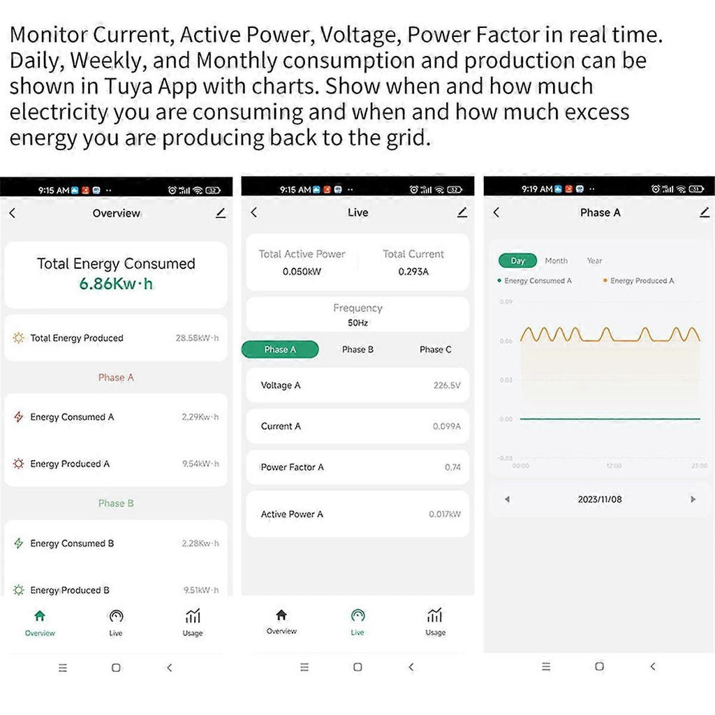The new version supports bidirectional measurement and photovoltaic measurement Single/3 - phase electricity compatible.Three current for Single phase application Measures real-time Voltage, Current, PowerFactor, ActivePower and total energy consumption Display the temperature of the device on the App Suitable for both residential and commercial application Important information: The power clamp must be installed and serviced only by a qualified electrical personnel. Do not touch the terminals of the device during testing. Turn off all the power supply for this equipment before installing. Always use a properly rated voltage sensing device to confirm power is off. Replace all devices, doors and covers before applying power to the equipment. Failure to follow these instructions will result in death or serious injury. type: 300A Material: plastic colour: white Package Contents: 1 x 3 Phase WiFi Energy KWH Meter Only the above package content, other products are not included. Note: Light reflection and different displays may cause the color of the item in the picture a little different from the real thing. The measurement allowed error is +/- 1-3cm.
