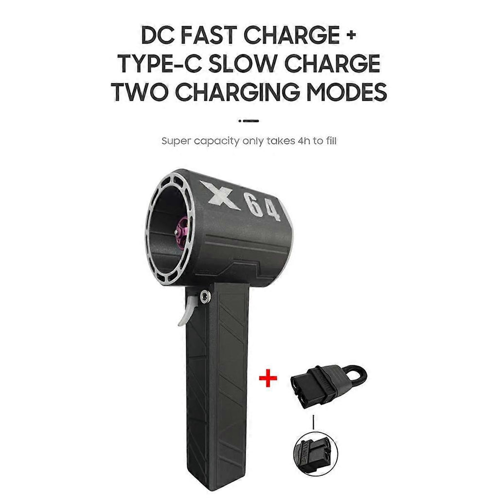 Two modes of charging: Type-c charging + DC fast charging, charging time is about 1 hour, charging power is 90w, Battery life is about 15 minutes at maximum wind speed when fully .