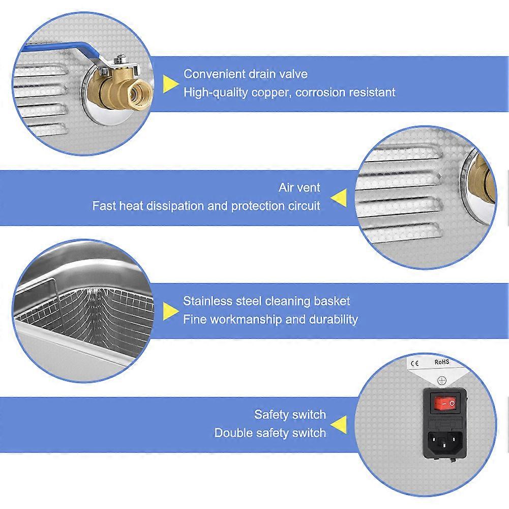 Feature:1. The drain valve made of high quality copper, corrosion resistant.2. 304 stainless steel handle, high hardness, rust prevention, long service life.3. Heat emission holes for faster heat dissipation and better circuit protection.4. With non-slip, shock-resistant foot pads, safe and reliable.5. Double insurance safety switch, safer to use.6. Industrial grade 304 stainless steel liner, stainless steel cleaning basket, fine workmanship and durability.Specification:Item Type: Ultrasonic CleanerModel: 50ALMaterial: SUS304Cleaning Tank Size: Approx. 300 x 240 x 200mm / 11.8 x 9.4 x 7.9inUltrasonic Power: 120 ~ 300wHeating Power: 400WFrequency: 40KHzCapacity: 14LNumber of Oscillators: 4Time Setting: 1-99 MinutesTemperature Setting: Room Temperature -80 Product Net Weight: 7531 g / 265.6 oz(approx.)Product Size: Approx. 330 x 270 x 320mm / 13 x 10.6 x 12.6in.Package List:1 x Washing Machine1 x Basket1 x Instructions1 x Power Cord