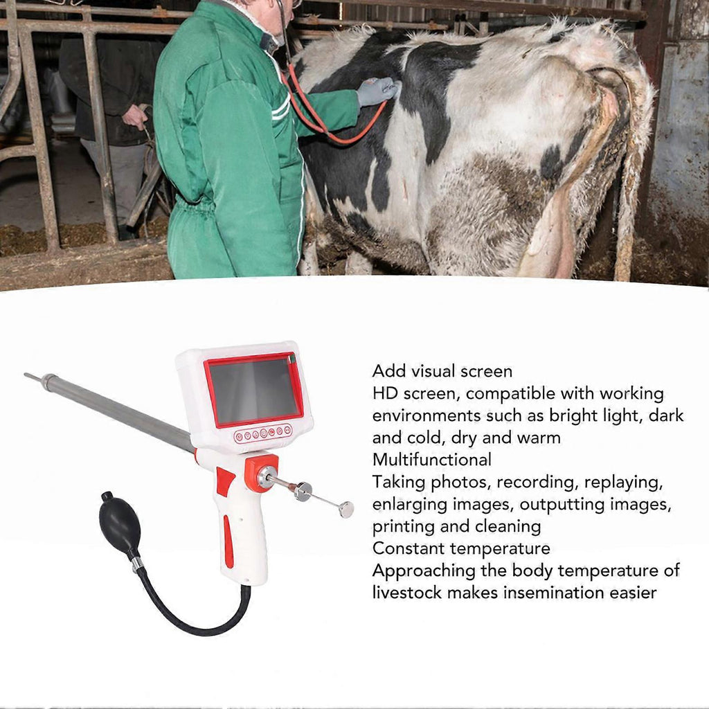 Feature:1. [Visual Screen] This animal AI gun is equipped with a high definition screen that adapts to various working environments, including strong light, cold, dryness, and warmth.2. [Multifunctional Design] The visual insemination device features photo taking, recording, playback, image enlargement, image output, printing, and cleaning functions. Clear record every moment with ease.3. [Constant Heat] Upgraded with a constant heat function that closely mimics the animal body temperature, this artificial insemination gun makes insemination easier and less uncomfortable for livestock.4. [Rotatable Screen] The display rotates 180 degrees left to right and 90 degrees up and down, providing convenience in monitoring the insemination process.5. [Probe Detail] Designed with an air channel to blow away water vapor caused by temperature differences or adhesive on the camera, ensuring clear monitoring.Specification:Item Type: Animal Visual Insemination GunMaterial: ABSBattery Specifications: 3.7V Rechargeable Lithium Battery 3000mAh (Built in)Plug Specifications: EU Plug 100-240VCamera: 1MPCamera Diameter: Approx. 3.9mm / 0.15inDisplay Screen: 4.3 InchResolution: 640 x 480Airway Mode: ManualFunctions: Video Recording, Photo Taking, PlaybackScreen Rotation Function: 180 DegreeStorage: Supports 32GB Memory Card (Shipped Without Memory Card)Semen Infusion Needle Length: Approx. 560mm / 22.05inSemen Infusion Needle Diameter: Approx. 5mm / 0.20inInsertion Tube Length: Approx. 340mm / 13.39inInsertion Tube Diameter: Approx. 20mm / 0.79inApplicable Frozen Semen Tube: 0.25mL, 0.5mL Universal.Package List:1 x Animal Visual Insemination Gun1 x Display Screen1 x Push Needle 1 x USB Data Cable1 x Adapter1 x User Manual2 x Keys1 x Toolbox