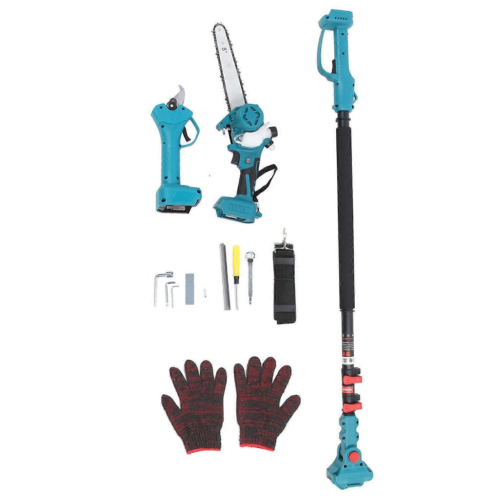 Feature:1. Extension Rod: This kit is equipped with an extension rod that supports height adjustment from 4.1 to 7.21 feet, allowing you to adjust the trimming distance at any time to meet your needs for trimming tall branches, which is safe and reliable.2. Blade and Handle: The pruning shears uses SK5 high carbon steel blades, which are incisive and durable, making it easy to cut 1.2 inch branches. The non slip rubber coating makes it comfortable to grip and reduces fatigue on the hands, arms, and wrists.3. 600W Brushless Motor: This chainsaw is equipped with 600W brushless motor, which ensures efficient pruning with strong power, prolongs the service life of pruning shears, and greatly reduces energy consumption.4. Safe Switch: The electric pruning cutter has built in safe switch. You need to quickly pull the trigger twice and the green light will light up. If the trigger is not pressed within 60 seconds, the pruner will enter automatic sleep mode to prevent accidental cutting.5. Convenient to Use: The cordless chainsaw and pruning shears are powered by 21V lithium battery (not included), making them easy to use anytime, anywhere. Equipped with wrench, screwdriver, screw, nut, baffle, and other tools, safe and practical.Specification:Item Type: Electric Chainsaw KitMaterial: ABS, Aluminum, SK5 High Carbon SteelBattery: 1 x 21V Lithium Battery (not included).Package List:1 x Pruning Shears1 x Electric Chainsaw1 x Extension Pole2 x Gloves1 x Socket Wrench2 x Hex Wrench1 x Grinding Stone1 x Screwdriver1 x Strap1 x Screw1 x Nut1 x Guard Plate1 x Wrench