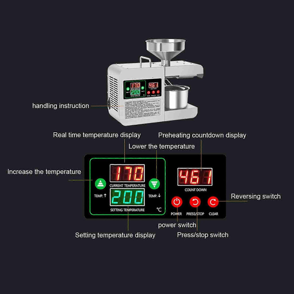 Feature:1. Healthier Oils: Compared with the oil sold in the store, with this tool, you can participate in the whole process of oil extraction by yourself, and you can also matching the raws materials yourself, which can give you healthier cooking oil.2. Preferred Material: This oil press machine is made of full stainless steel material, which has the characteristics of not easy to damage, and can provide a long service time.3. Intelligent Control: It is easy for you to operate through the button, and the current temperature can be displayed on the screen clearly.4. 820W Powerful Machine: The 820W powerful heating part allows you do not need to fry the material first. The machine can preheat the material before pressing it.5. The stainless steel squeeze rod can be quickly installed on the machine and easily removed for cleaning.Specification:Do you want to try to get oil by yourself? Are you still worried about the quality of the cooking oil you buy outside? Come and try this oil press machine. With this machine, you can also easily squeeze oil in your own home. This machine can effectively extract fat and retain the rich nutrients in the food. Come try it, it will not let you down.Specifications:Material: stainless steelPower: 820WHeating power: 600WItem size: 330 * 310 * 155mm / 12.9 * 12.2 * 6.1inPackage size: 430 * 290 * 210mm / 16.9 * 11.4 * 8.3inPackage weight: 8000g / 17.6lb.Package List:1 * Oil Press Machine Set with Plug
