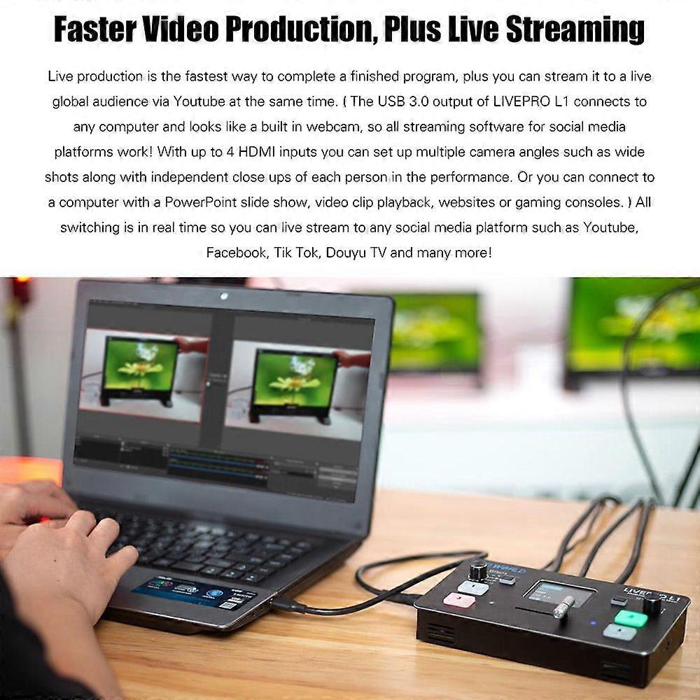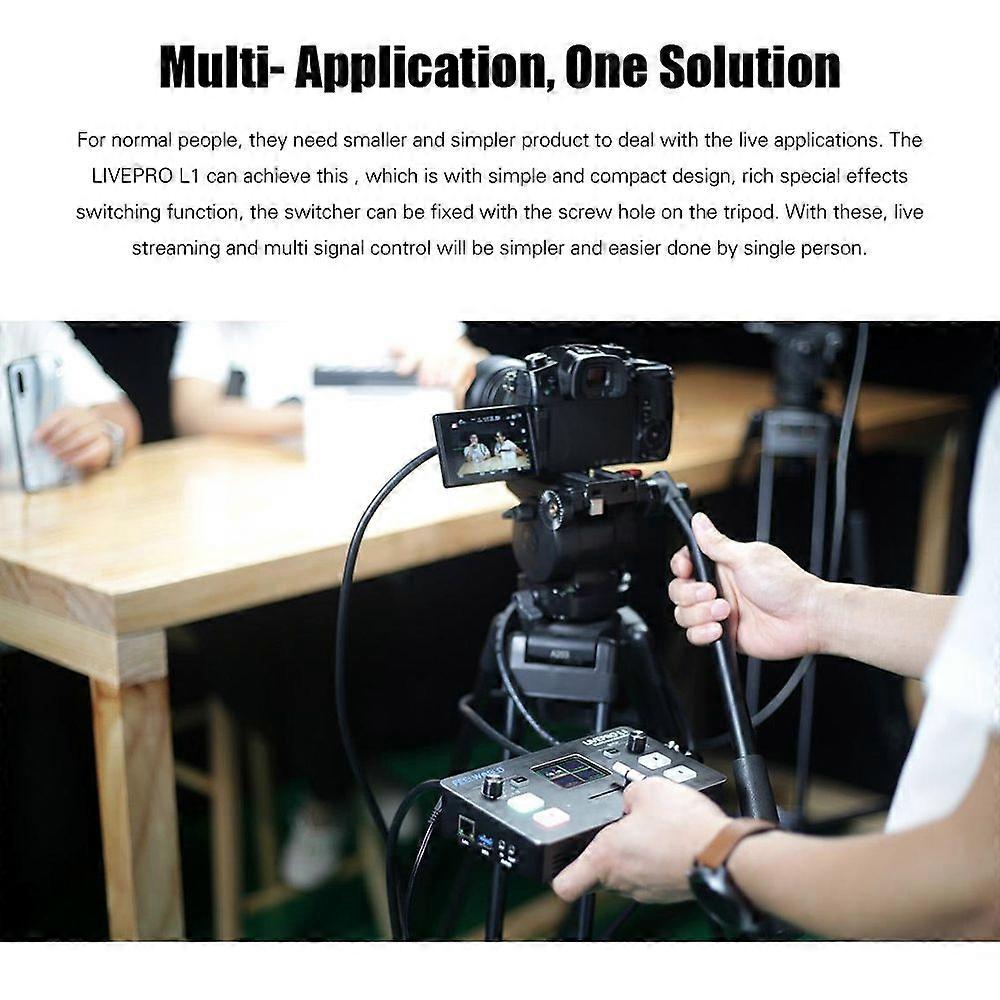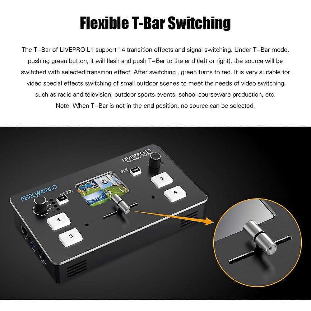 Feature:Specification:Features:Multi-Camera Live Production:Professional multi-camera production video switcher, stream to live broadcasting platform via third party software. All switching is real-time so you can live stream to any social media platform to share.4 HDMI Inputs & 1 HDMI Output:4 x HDMI inputs from cameras, computers, laptops and 1 HDMI output for external 1080P video transmission. With LAN interface for computer connection and control, 3.5mm audio input and output are accessible.USB 3.0 Live Streaming:LIVEPRO L1 features a USB 3.0 connection that operates as a simple webcam source. Plug in and get working with video software, in full resolution 1080HD quality, widely applicable for live streaming.6 Picture PVW & PIP:When the switcher is connected with an external expansion screen, it can preview real-time monitoring on 6 pictures. Plus, your can set 9 layouts of PIP(picture in picture) mode.Audio Embed & De-embed:Not only you can embed analog audio into a HDMI signal for recording or live streaming, you can also extract the audio to send over to a larger dedicated audio mixer. LIVEPRO L1 integrates the two functions in one.Flexible T-Bar Switching:The T-Bar supports 14 transition effects and signal switching. Suitable for video special effects switching of small outdoor scenes to meet the needs of video switching such as radio and television.Exquisite & Controllable:With 4 buttons for selecting input signals, SW button to choose different functions, knobs for voice volume control and menu setting. 2.0-inch TFT screen let you to preview 4 HDMI signals and easily set menu.Specifications: Brand: FEELWORLDModel: LIVEPRO L1Color: BlackMaterial: ABSScreen Size: 2.0inch TFT screenBack-light: LEDInput: 4 * HDMIOutput: 1 * HDMIAudio In: 1 * 3.5mm stereo jackAudio Out: 1 * 3.5mm stereo jackInput Resolution: SMPTE 720p@50/60, 1080i@50, 1080p@23/24/30/50/601024*768@60, 1280*720@60, 1280*768@60, 1280*800@60, 1280*1024@60, 1360*768@60, 1366*768@60, 1440*900@60, 1600*1200@60, 1680*1050@60,1920*1080@50i, 1920*1080@60, 1920*1080@60i, 1920*1200@60Output Resolution: HDMISMPTE 720p@60, 1080p@601024*768@60, 1280*720@60, 1280*768@60, 1280*800@60, 1280*1024@60, 1360*768@60, 1366*768@60, 1440*900@60, 1680*1050@60, 1920*1080@60Power Adapter Input: AC100~240VDimension: 18.5 * 11 * 3.9cm / 7.28 * 4.33 * 1.54inPackage Size: 26 * 13.5 * 8cm / 10.24 * 5.31 * 3.15inPackage Weight: 1160g / 10.92ozPacking List:1 * Video Switcher1 * HDMI Cable2 * Power Adapters(EU Plug, US Plug)1 * Extra Radiating Fan1 * User ManualPackage List:1 * Video Switcher1 * HDMI Cable2 * Power Adapters(EU Plug, US Plug)1 * Extra Radiating Fan1 * User Manual
