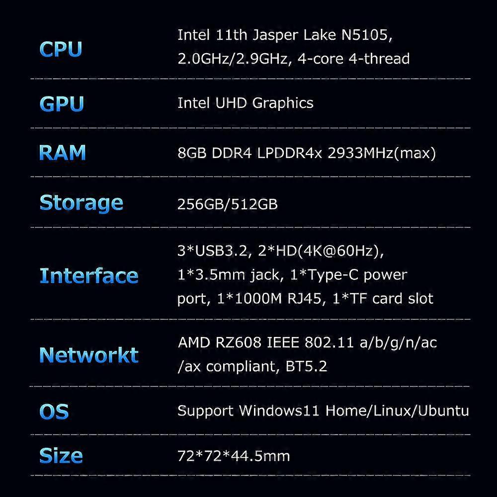 Feature:1. Powered by Intel 11th Jasper Lake N5105 processor with 4-core 4-thread, 2.0GHz base frequency and 2.9GHz burst frequency. And it comes with Intel UHD Graphics GPU, fast response, smooth running.2. It has the latest Wi-Fi 6 chip inside, which reduces power consumption by 30% and lowers the latency. And the WPA3(WiFi Protected Access 3) improves the level of security compared to the widely popular WPA2 standard, yet maintains backward compatibility.3. Equipped with two HD 2.0 video output interfaces, supporting dual-screen display for 4K@60Hz premium productivity, to improve your working efficiency.4. This mini PC provides 3*USB3.2, 2*HD(4K@60Hz), 1*3.5mm jack, 1*Type-C power port, 1*1000M RJ45 and 1*TF card slot for plug-and-play functionality for a full range of simultaneous work and entertainment applications.5. It packs with a large heat pipe, large conducting copper tube, making sure it can dissipate the heat efficiently so you can enjoy using it as long as possible.Specification:Features:Powered by Intel 11th Jasper Lake N5105 processor with 4-core 4-thread, 2.0GHz base frequency and 2.9GHz burst frequency. And it comes with Intel UHD Graphics GPU, fast response, smooth running.It has the latest Wi-Fi 6 chip inside, which reduces power consumption by 30% and lowers the latency. And the WPA3(WiFi Protected Access 3) improves the level of security compared to the widely popular WPA2 standard, yet maintains backward compatibility.Equipped with two HD 2.0 video output interfaces, supporting dual-screen display for 4K@60Hz premium productivity, to improve your working efficiency.This mini PC provides 3*USB3.2, 2*HD(4K@60Hz), 1*3.5mm jack, 1*Type-C power port, 1*1000M RJ45 and 1*TF card slot for plug-and-play functionality for a full range of simultaneous work and entertainment applications.It packs with a large heat pipe, large conducting copper tube, making sure it can dissipate the heat efficiently so you can enjoy using it as long as possible.The product has pre-installed Windows 11 Home operation system, delivering best possible use experience. It also supports Linux/Ubuntu system.It can be mounted on the back of the monitors/TVs via the bracket(not included) to save space.Specification:Brand: GMKModel: KB5CPU: Intel 11th Jasper Lake N5105, 2.0GHz/2.9GHz, 4-core 4-threadGPU: Intel UHD GraphicsRAM: 8GB DDR4 LPDDR4x 2933MHz(max)Storage: 256GB/512GB(optional)Interface: 3*USB3.2, 2*HD(4K@60Hz), 1*3.5mm jack, 1*Type-C power port, 1*1000M RJ45, 1*TF card slotNetwork: AMD RZ608 IEEE 802.11 a/b/g/n/ac/ax compliant, BT5.2Supported OS: Windows11 Home/Linux/UbuntuItem size: 7.2 * 7.2 * 4.45cm /2.83 * 2.83 * 1.75inItem weight: Approx. 204g /7.2ozPacking list:1 * Mini PC1 * Power adapter1 * User manualPackage List:1 * Mini PC1 * Power adapter1 * User manual