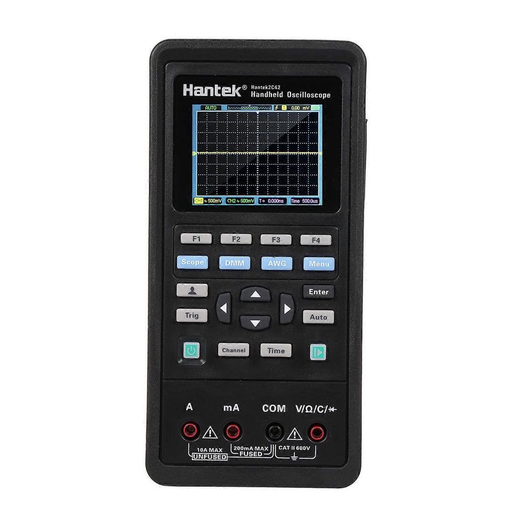 This all-new handheld oscilloscope is really practical for use with a new generation of 2 in 1 multifunction tester: oscilloscope and multimeter. Its sampling rate is 250MSa/s and its bandwidth is 40MHz. Support multi-angle adjustment, ultra-low-power, Type C charging interface, each 2 hours battery charge allows working one full day or standby two months. Output sine, square, triangle, trapezoidal and other waveforms output. Features: 2-in-1 Oscilloscope + Multimeter: This multi-purpose oscilloscope owns 2 universal test instrument functions. Necessary helper for an engineer. Intelligent Charging Control: 5V/2A large current or USB port of ordinary computer can be charged, easy to use, very convenient and handy with AUTO one-key test. Ultra-low Power Design: Type C charging interface, and standby for 2 months after every recharge of 2 hours with large capacity replaceable lithium batteries power supply. Universal Multimeter Function: Test voltage, current, resistance, diode, capacitance, continuity. 5V/2A Charger + Type C Charging Cable: Type C power + data transfer interface, can share the charger and data cable with your mobile phone. Small In Size & Held In Single Hand: The 45 degree suspension bracket design provides you a work station anywhere anytime. One Key Export Out & Quick Comparison: 2 groups of reference waveform + 6 groups of waveform storage, simple and effective. Digital Voltmeter Function: Automatic frequency and amplitude measurement, convenient to use and it supports Chinese & English menu display. With Cursor Measurement Function: Supports time and voltage manual measurement, and measure the required waveform accurately. Color LCD Screen: Exquisite and smooth lines make the waveform clear and undistorted when magnify with minimalist keyboard design simplify operation. Unibody Casing: Fine touch feeling, favorable impact resistance, outstanding heat resistance, easy to disassemble. Self Calibration Function: Free from level drift after long time unused. Scan Code for Video Help Function: Scan code on back of machine to get help of online video help. Specifications: Battery Charger Plug Type: US / EU (Optional) Bandwidth: 40MHz Power Supply: AC 110-240V 50/60Hz Display: Full Color TFT LCD Display(320*240 pixels) Channel: 2CH + DMM Horizontal: Sampling Rate Range: 250MSa/s(Single-channel), 125MSa/s(Dual-channel) Waveform Interpolation: (sin x)/x Record Length: Max. 6K when single-channel, 3K each channel when dual-channel SEC/DIV Range: 5ns/div500s/div 1, 2, 5 step-by-step Vertical: A/D Converter: 8-bit resolution,each channel sampled simultaneously VOLTS/DIV Range 10mV/div10V/divat input BNC Bandwidth Limit, Typical: 20MHz Low Frequency Response (-3db): 10Hz at BNC Rise Time at BNC, Typical: 5ns Vertical Gain Accuracy: 3% for Normal or Average acquisition mode Note: Bandwidth reduced to 6MHz when using a 1X probe. Power Supply: 2 * Built-in 3.7V 2600mAh Battery Product Size: 199 * 98 * 40mm / 7.8 * 3.9 * 1.6in Product Weight: 640g / 22.6oz Package Size: 25 * 19 * 10cm / 9.8 * 7.5 * 3.9in Package Weight: Approx. 1314g / 46.4oz Package List: 1 * 2-in-1 Oscilloscope 1 * Clip Probe 1 * Test Probe 1 * Power Adapter 1 * USB Charging Cable 1 * Multimeter Probe 1 * Storage Bag Model Hantek2C42 Oscilloscope Mode Bandwidth 40MHz Channel 2CH+DMM Horizontal Sample Rate Range 250MSa/s(Single-channel), 125MSa/s(Dual-channel) Waveform Interpolation (sin x)/x Record Length Max. 6K for single-channel; 3K samples per dual-channel SEC/DIV Range