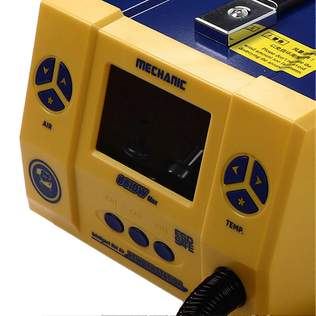 Feature:1. BRUSHLESS TURBO FAN: Using new brushless fan, the air is soft and low noise, with adjustable airflow and wider use range, which is stable and efficient with long life.2. MICROCOMPUTER CONTROL: Sensor closed loop, microcomputer zero cross trigger, large temperature control power, rapid temperature rise, convenient adjustment, accurate and stable.3. PASSWORD PROTECTION: Non related personnel cannot arbitrarily change the set parameters to ensure the default temperature process, safe in operation.4. AUTOMATIC SLEEP: With magnetic control switch inside, the handle is placed on the holder, and the air gun automatically enters the cooling function and is in a standby state.5. QUICK SETTINGS: Press CH1 CH2 CH3 keys to select different channels, and 3 different working modes can be set according to different work needs.6. HD COLOR SCREEN: The hot air rework station adopts high definition large color screen display, the display is clear, intuitive and more convenient.Specification:Item Type: Hot Air Rework Station KitItem Model Number: 861DW MaxPower: 1000WTemperature Range: 100-500Air Volume Gear Range: 01-120 gearsOperating Environment Temperature: -10-45Operating Environment Humidity: 45-80%RHScreen Display: HD LCD DisplayFan Type: Brushless Turbo FanTemperature Calibration: Digital Temperature CalibrationTemperature Control Method: Microcomputer Temperature ControlQuick Setting: CH1 CH2 CH3Nozzles: 5MM, 6MM, 8MM, 10MM.Package List:1 x Host1 x Air Gun Holder1 x Power Cord1 x User Manual4 x Nozzles