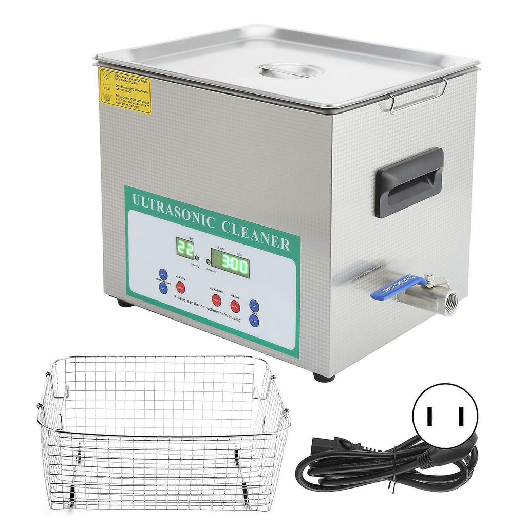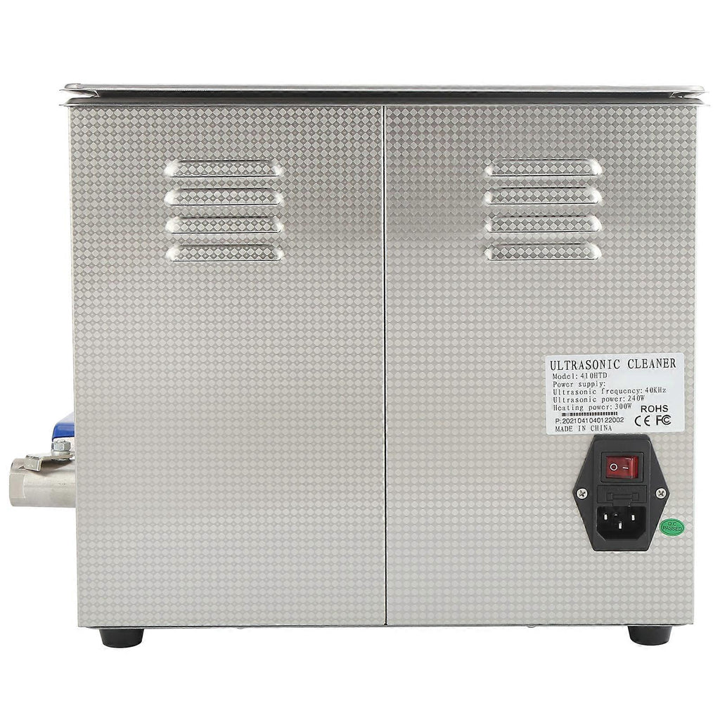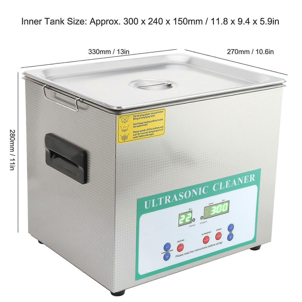 Feature:1. The powerful professional cleaning system can clean jewelry, glasses, rings, diamonds, necklaces, watches, coins, parts, etc. clean without damaging them.2. Excellent cleaning results can be obtained every time, making this heated ultrasonic cleaner very suitable for commercial or home use.3. The washing machine has a debubble function, starting this function for a few minutes before cleaning will make the cleaning liquid in the washing machine more efficient.4. Using ultrasonic vibration technology to clean the parts, the cleaning ability is strong for small objects with complex structures or irregular shapes.5. The 1.1mm thick stainless steel inner grooves is used for onetime stamping and a simpler operation panel, which makes cleaning easier.Specification:Item Type: Ultrasonic Washing MachineMaterial: Stainless steelCapacity10LInner tank size (mm)(approx.)300 x 240 x 150mm / 11.8 x 9.4 x 5.9inSize (mm)(approx.)330 x 270 x 280mm / 13 x 10.6 x 11inPacking sizemm(approx.)430 x 335 x 350mm / 16.9 x 13.2 x 13.8involtageAC:110V/60Hz/220V/50HzShake head4Ultrasonic power240WUltrasonic frequency40KHzHeating power300WDrainG3/8in water valveTime control (minutes)Digital LCD control 0-99 minutesTemperature control ()0-80Cleaning basketWithSound reduction coverWith .How to Use: 1. Fill at least 2/3 of the stainless steel water tank with detergent. According to the cleaning requirements, it is recommended to use a small amount of cleaning solution, as this will help improve performance.2. Remove the spare parts to be cleaned as much as possible, and use a high-pressure spray gun, wire brush, scraper or other tools to remove dirt, carbon deposits, etc., to extend the service life of the cleaning solution and ensure the cleaning speed and performance.3. Put the accessories to be cleaned into the water tank so that they are completely immersed, but try not to overlap.4. Start Ultrasonic Cleaning: A. Connect the power socket on the back to the power source with the power cord (the red indicator light will light up, and the LED screen will display "180")B. Press The "time" Button To Switch The Display Time In the following time cycle: 90S-1205-150S-180S -210S-240S-270S-300S-330S-360S-540S-720S-900S-18M-21M -24M- 27M -30M-90s (a total of 18 cleaning times).C. Press the "ON/OFF" button once to start cleaning the machine. The blue ultrasonic indicator lights up and the set time starts to count down. When the time reaches "886", the machine will automatically stop working. In addition, the ultrasonic cleaning can also be stopped by pressing ON/OFF again.D. Unplug the power cord, pour in the cleaning solution, and moisten the water tank and shell with a clean cloth.5. In order to enhance the cleaning effect, you can add an appropriate amount of detergent to the solution or extend the cleaning time.6. The machine will stop working after 45 minutes of continuous work, and can restart work after 4 minutes of rest.7. The machine has a function of removing air. Long-term use of cleaning fluid can turn on this function, which can clean more cleanly.Package List:1 x Washing Machine 1 x Cover 1 x Cleaning Net1 x Plug1 x User Manual