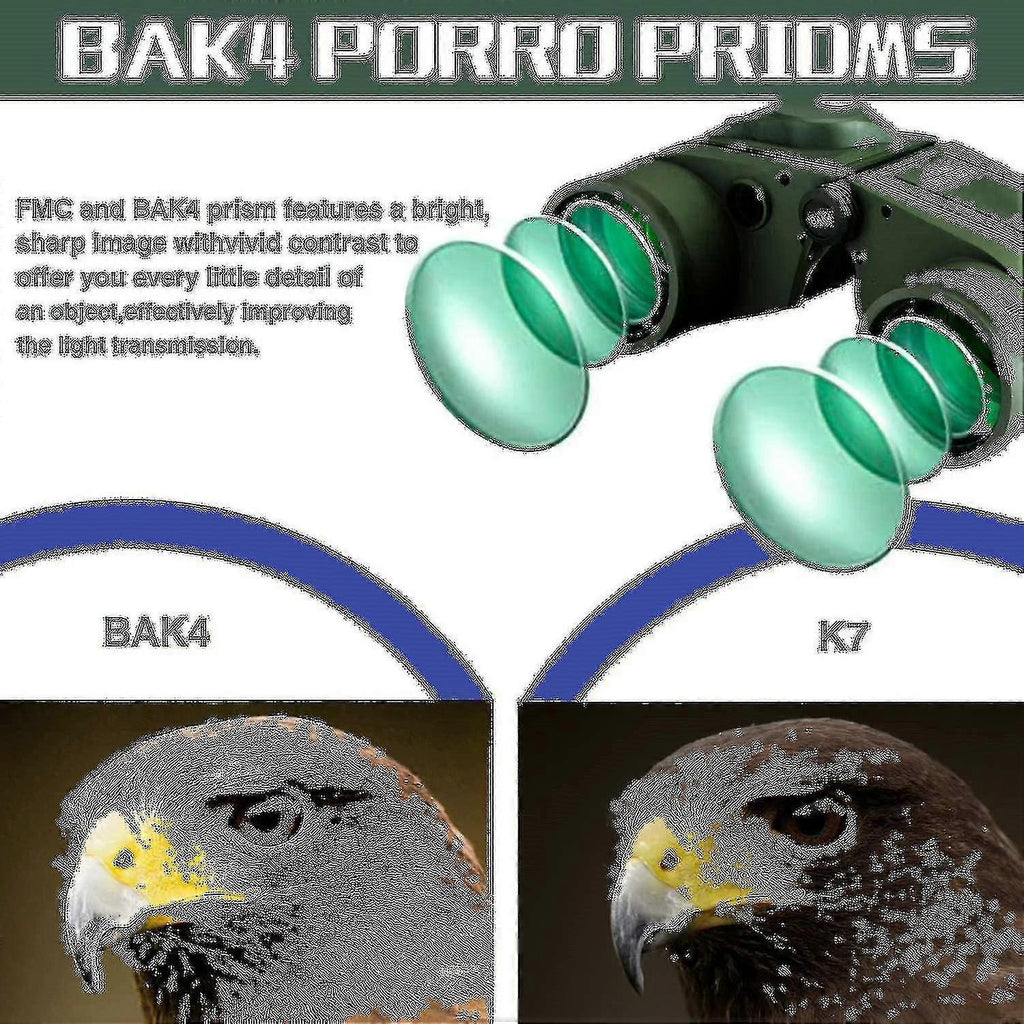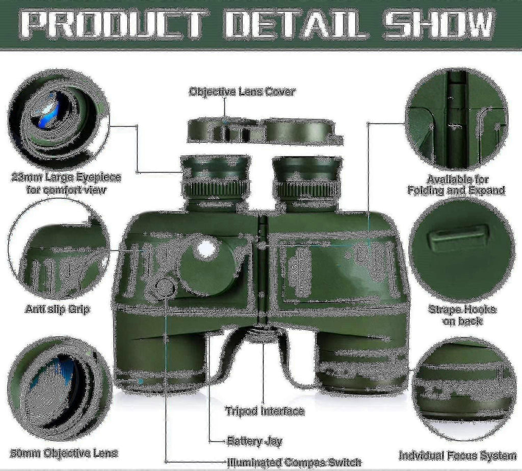10x50 marine binoculars, binoculars with night vision, rangefinder and compass, for water sports enthusiasts and hobby sailors, including ever-ready case, dust caps and shoulder strap,(green) The product is shipped based on the color or size of the main image of the product page. Military grade binoculars --Meet 5 military standards: impact resistance, impact resistance, flood resistance, high (+ 55 ) and low (-43 ) temperature resistance; Built-in military binoculars Illuminated digital compass and range finder perfect for hunting, sailing, marine, wildlife watching, tourism, cross-country skiing and all outdoor activities.High quality optics --HD design, 10x magnification; 50mm lens, 396 feet, 1000 meters field of view, high quality Bak-4 prism, FMC multi-coated optical lenses that allow you to enjoy a wide and clear view due to the high penetration of the lens and its high collection of light make you distant Objects and landscapes clearly in your eyes.IPX7 Waterproof Binoculars - Dry nitrogen filled and O-ring sealed for waterproof protection to prevent dust, fog and moisture damage in extremely harsh environments and in all weather conditions; These are also military marine binoculars for better waterproof protection and swimming on the water, so don't worry if it falls into the water. The non-slip rubber armor absorbs shocks, is comfortable to hold and use and extremely durable.Comfortable and ergonomic design - 23 mm eyepiece for easy viewing; Adjust the sharpness of the left and right eyepieces better individually to support people with different eyesight. Tripod adapter for tripod attachment for more stability. With a thick neck strap, elastic shoulder strap and binocular strap, you can carry these large binoculars outside and let go of your hand.