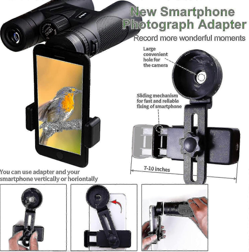 Description 12 times magnification effect,clear HD vision:12 times magnification is suitable for telescope observation. If the magnification is too large, it will make the vision unclear and easily lead to dizziness. However, if the magnification is too low, you cant see the details clearly. 12 x lens is the right choice for you. Fully Mulit-Coating 18mm Large Eyepiece provides a clearer and brighter view:FMC can increase the light transmittance, so the color reproduction of the image is higher. It is easier for you to find the prey and enjoy your beautiful scenery everywhere.18 mm Large eyepiece binoculars make full use of 12x magnification, maybe the ideal choice for Watching Concert, Sports, Bird,Prey and Stargazing etc. Binoculars with Smartphone Adapter,More ways to use:The phone adapter is compatible with many types of mobile phones as iPhone 1211 11Pro XRX, 8P, 8, 7P, 7, 6, 6s, 6P, 5, 5s, Samsung GALAXY S8, S7, S6, S6 Edge, S5, Note, Huawei, LG, HTC, Sony, Etc.Easy to carry,portable and stable, so you can use your mobile phone to record beautiful moments anytime, anywhere. BAK4 Roof Prism Binoculars,Clear View:BAK4 Roof Prism get 32% more light than 12.5mm prism lens,13.7% of 14.5mm prism lens,so 16.5mm Prism lens take advantage of 42mm objective lens, can deliver clear vision. Good Guality You Can Trust:Our birding binoculars would be a great gift.You can give it to your friends, family and lover.If you have any problems, please feel free to contact us anytime, we will be very happy to help you