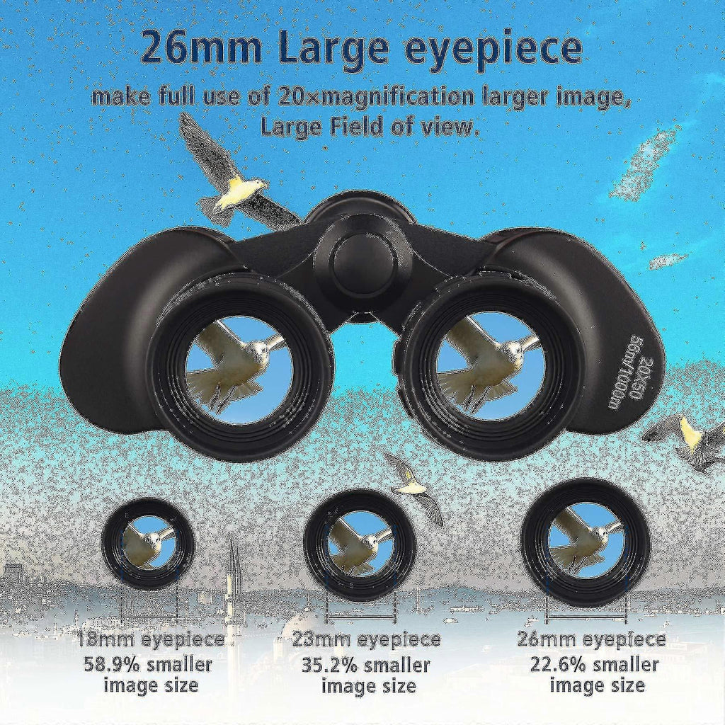 Powerful binoculars: 20x magnification, 50mm diameter lens and 26mm diameter eyepiece lens, 56m-1000m field of view, large field of view and clearer. Perfect for bird watching, tourism, hunting, wildlife viewing, camping, hiking, sports and astronomy.Clear Image - Aspherical lenses coated with multiple layers for minimum light reflection and distortion, better brightness contrast and quality even in low light. The Bak-4 prism has a perfectly round exit pupil. You can see a clear, crisp and clear view.STYLISH AND STRONG: Rubber finish for impact resistance and a firm and comfortable grip, durable. Compact and powerful folding. Waterproof and anti-fog.Easy to use: Focus by adjusting the right eyecup and the center dial. Super easy for everyone. This pair of binoculars can be used with a tripod. So it is very convenient when you watch something for a long time.Compact and lightweight size: lightweight and foldable. It comes with a portable bag, a protective cover for the eyepieces, a cleaning cloth and a neck strap for binoculars, very convenient and easy to carry. It is an ideal gift for adults, children and children.