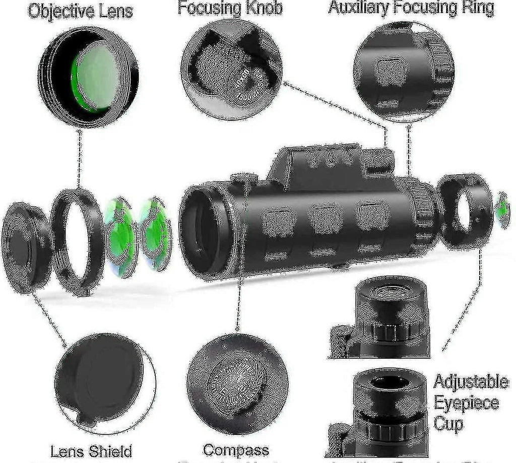 Description High Power Monocular Telescope - bring you clear and bright images, ensuring the view for your daily outdoor adventures. This monocular telescope is the necessary outdoor accessory for you to enjoy bird watching, wildlife observing, hunting, hiking, camping, travelling, etc.High Resolution Imaging The telescope is equipped with the FMC multi-layer coating and BAK4 prism which can eliminate the phase shift phenomenon. The image transmittance is up to 99.52%, which makes your view brighter, clearer and delivers crisp images.One Hand Focusing, Waterproof Fogproof The ergonomic design of this telescope helps you focus on your target quickly and accurately with one hand. And the durable rubber armor with stripes provides comfortable and non-slip grip. Its easy to carry with the wrist strap included. IPX5 Nitrogen-Filled coating and sealed optics prevent moisture, dust and debris. This monocular telescope will do its job in most weather conditions with fog-proof and dust proof function.Widely Compatible with Smartphones Coming with the latest quick alignment smartphone holder, our monocular telescope can be used with a smartphone for pography. And adjustable tripod can be used for stationary pography or selfie. The holder adapts to almost all types of mobile phones on the market, such as iphone, samsung, ulefone, sony, etc. Its easy to install and can help you share your beautiful images or videos with your family and friends.Easy to Use This monocular telescope is designed to be in daily use and non-professionals can also easily get started. Handed in size and lightweight, easy to carry with the included storage bag. Ideal for outdoor living, like bird watching, wildlife observing, sightseeing, trekking, traveling, camping or matches, concerts. It also can be a perfect gift for women, men, outdoor enthusiasts and children. Keep their curiosity to observe and explore the world.