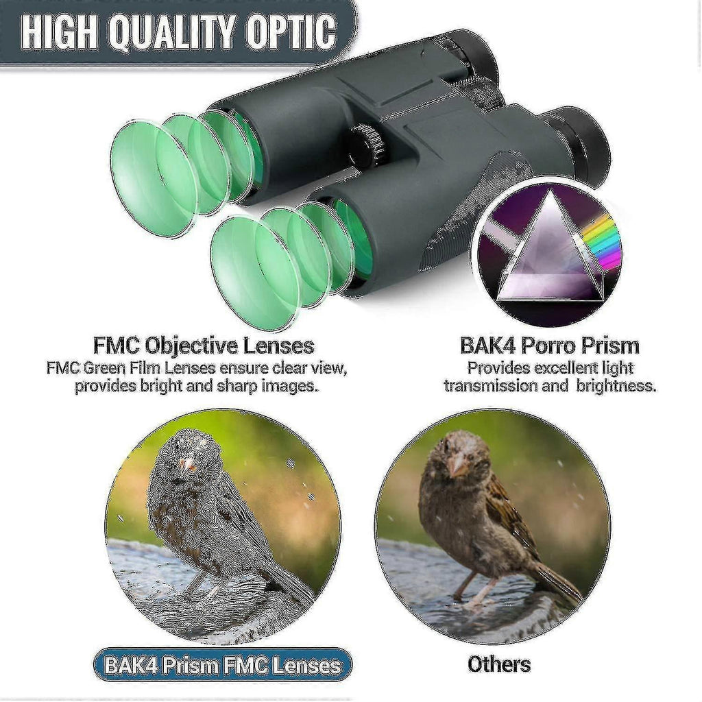 10X42 Binoculars - 10X magnification, 303ft / 1000m2 wide field of view, specially designed for outdoor activities like mountaineering, hiking, driving, hunting, wildlife viewing and scenery.High Quality Optical Parts - Adult Binoculars The 42mm multilayer coated film lens and 18mm eyepiece ensure a critical optical component. Let your vision become brighter and sharper and deliver razor-sharp images.Durable frame and rubber armored housing - firm protection allows it to withstand the harshest weather conditions. The shock-absorbing rubber housing absorbs vibrations while providing a firm grip for maximum protection.BaK-7 roof prisms for bright, clear and crisp imagesCompact and durable design - compact shape and appearance, durable metal internal shell structure, classic and durable.