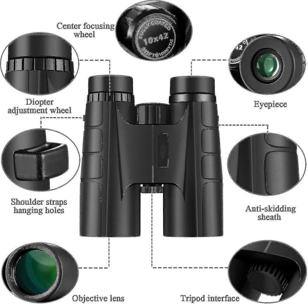 10X42 Binoculars - 10X magnification, 303ft / 1000m2 wide field of view, specially designed for outdoor activities like mountaineering, hiking, driving, hunting, wildlife viewing and scenery.High Quality Optical Parts - Adult Binoculars The 42mm multilayer coated film lens and 18mm eyepiece ensure a critical optical component. Let your vision become brighter and sharper and deliver razor-sharp images.Durable frame and rubber armored casing - firm protection allows it to withstand the harshest weather conditions. The shock-absorbing rubber housing absorbs vibrations while providing a firm grip for maximum protection.High Profile - A 2018 latest quick alignment smart phone adapter comes with the telescope setup. Compatible for iPhone 7p, 7.6.6s, 6plus, 5s, Samsung GALAXY S6, S6 edge, S5, etc.