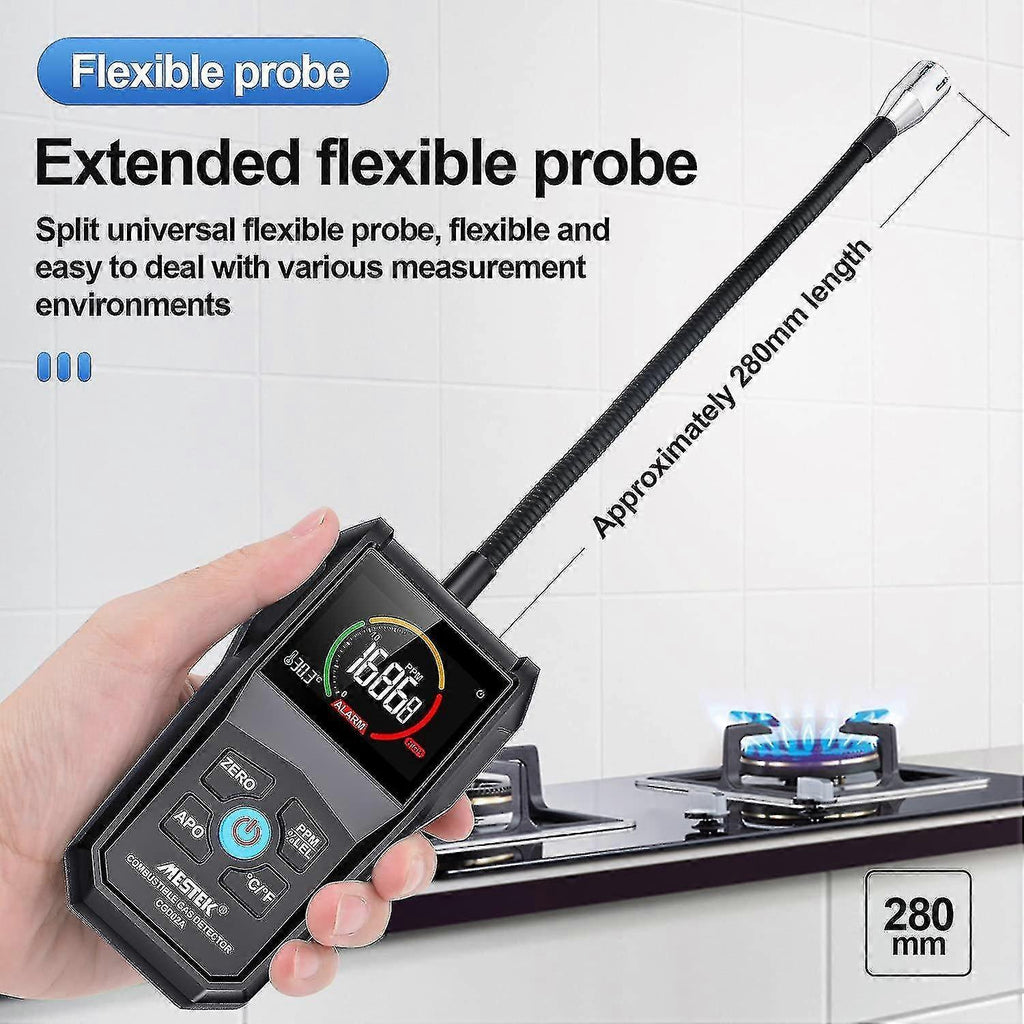 ALL-IN-ONE MACHINE: Gas Detector is equipped with high-performance sensors, ultra-high sensitivity detection of 500 ppm, ultra-fast response speed of 2 seconds, calibration automatic within 30 seconds of starting, 360 ultra-flexible detection, 270mm metal pipe, 10 minutes automatic shutdown function More energy saving and environmental protection. /p> ULTRA CLEAR COLOR DISPLAY: Natural gas leak detector adopts VA reverse display color screen, ultra-clear digital and analog dual display and simple button operation. Double Alarm--If the detected leak value is greater than 25% leL / 12500PPM, the gas detector will beep continuously and the display will also show HIGH. PORTABLE DESIGN: Flammable Gas Leak Detector is small in size and easy to carry, and the double-layer protective cover is very suitable for working. The metal sensor is shielded by a flexible metal pipe to reduce interference, precisely lock the vanishing point, and flexibly adjust the arc, which is suitable for various special scenes. A MULTI-PURPOSE MACHINE: Portable gas detector is suitable for gas pipeline leak detection, household gas prevention, oil and gas mining, tunnel mining operations, chemical industry, to metallurgy, petroleum refining, biochemical medicine and other industries. Gas leaks in narrow areas can also be detected.