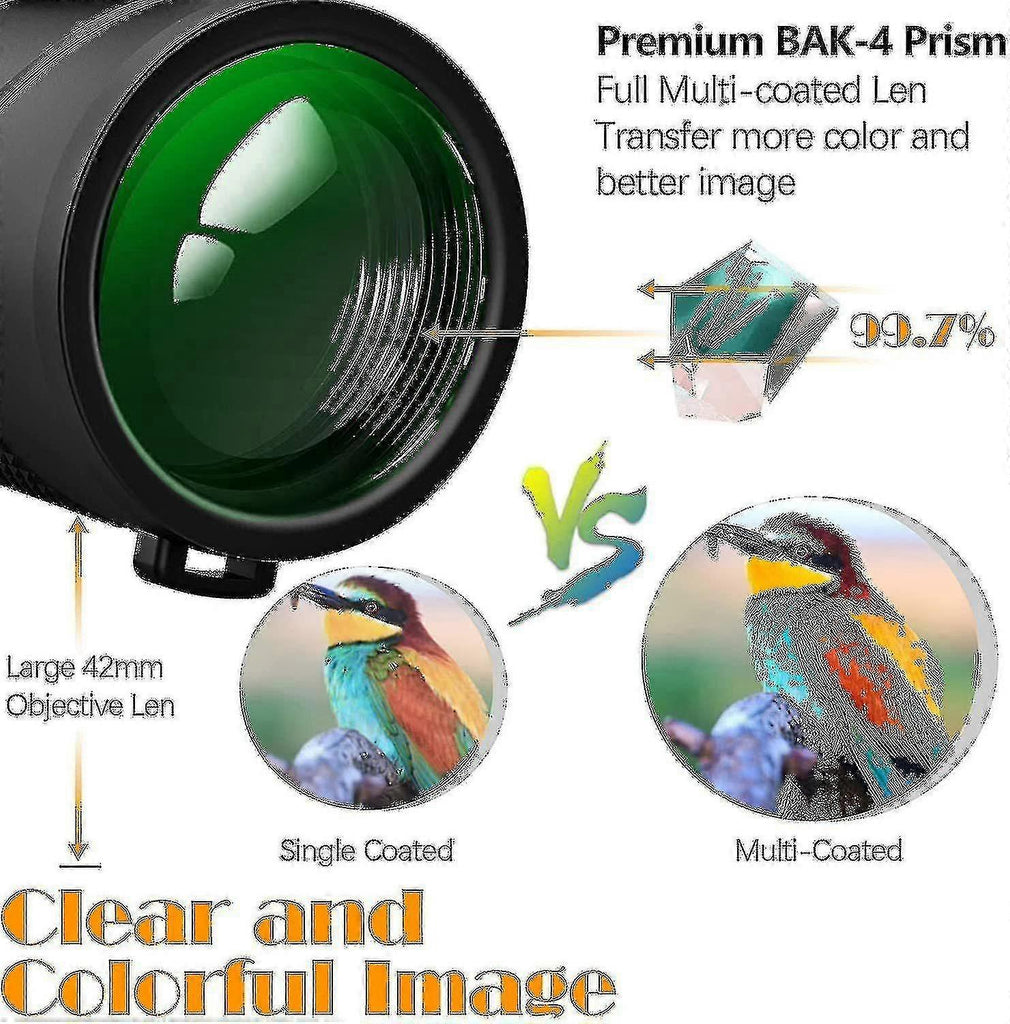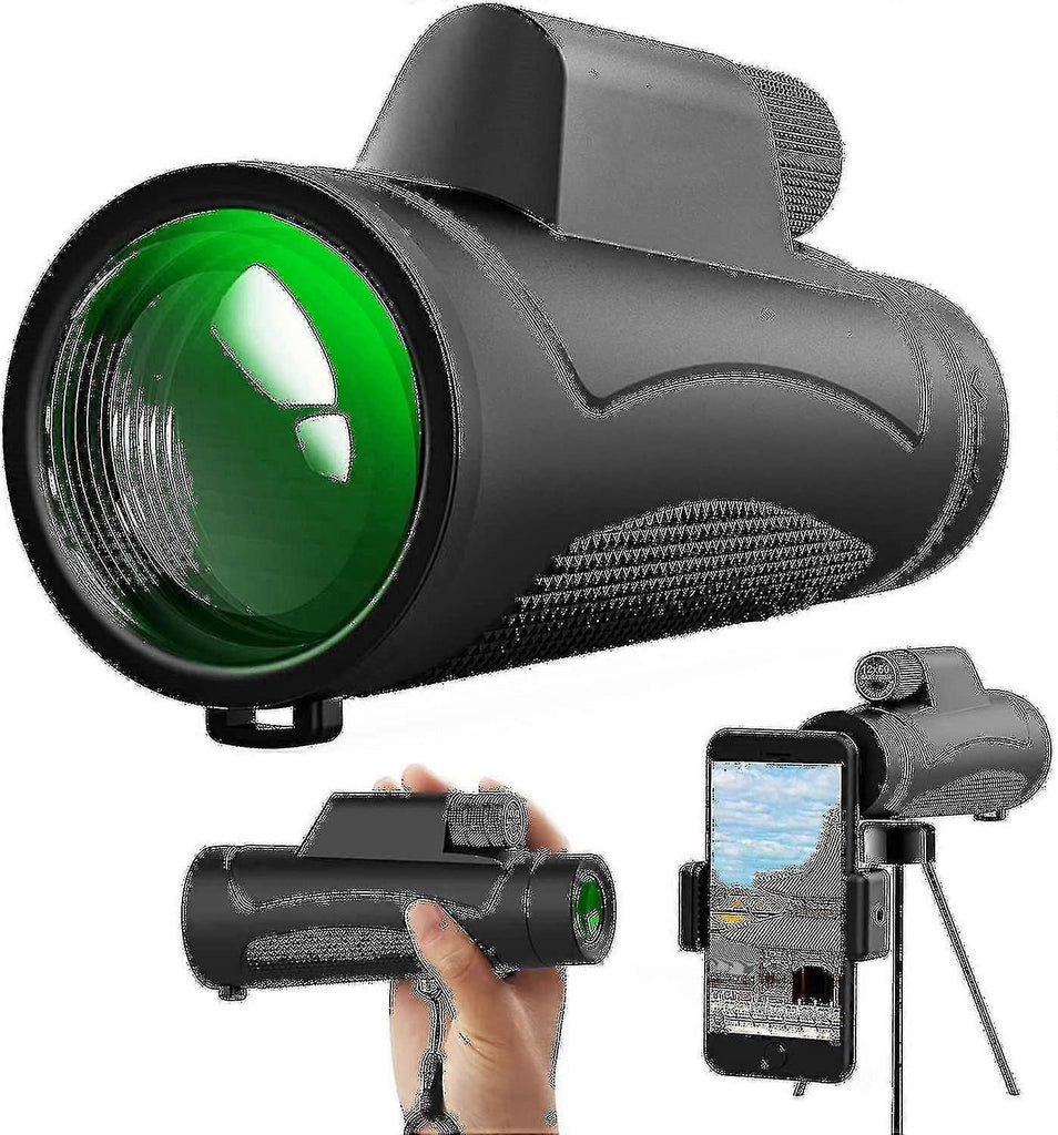 12x50 HD Premium Monocular12x50 HD Monocula.12X magnification and 50mm object lens diameter monocular, provides a clearly, bright image and different fields of view. Perfect for hiking, climbing, hunting, bird watching, ball games, concerts, watching wildlife and sceneryUnique Product DesignThe monoculars come with a full rubberized armor for total protection,concave-convex design is more stable to one-handed hold. This monocular telescope for smartphone has a tripod interface ,you can attach the tripod adapter and smart phones to look at things for a long time, and also maintain a stable line sight.BAK4 PrismThe Monocular telescope with high light transmittance BAK-4 prism and full multilayer coating lens coating, sharp and transparent imaging, bright without dark edgespresent more real images.Waterproof TelescopeThis high-listed eyepiece, built-in lens dust cap and O-ring sealed optical elements, can prevent the lens from dust/moisture/debris, ensure the waterproof function of life, suitable for most weather and environments (Note:Cannot be used in heavy rain or immersed in water for a long time.)Best Travel CompanionComfortable handheld telescope is convenient, sturdy and easy to install in your pocket to watch it everywhere.It is a good hiking accessory Every moment of the wonderful picture is a panoramic view.