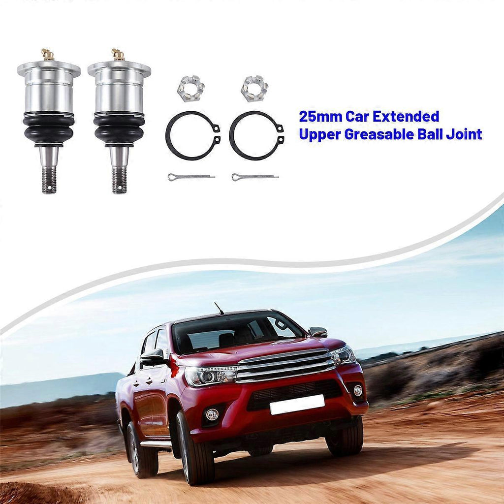 25mm Extended Front Greasable Upper Ball Joint For Kun25 Kun26 4WD 2005-2020 When the vehicle's suspension is lifted the upper arm moves to a downward position reaching the maximum angle of the standard ball joint. This extended ball joing allows the arm to be returned to a near standard position allowing full suspension movement without binding. Features : Heavy Duty Greasable design Low friction and high performance Mirror finished ball stud for smooth operation and longer wear High quality (chloropene rubber) dust boot High static and dynamic load capabilities Rigorously tested Fitment: For 4 RUNNER 4TH GENERATION (SURF) 2WD/4WD(2002-2009) For 4 RUNNER 5TH GENERATION (SURF) 2WD/4WD(2009-ON) For AUV GGN25R, KUN26R 4WD Model (2005-2014) 2015++ Important Notes : Not Including Installation Guide or Manual Professional Installation is Recommended If you have a lifted 05-on and during articulation you hear a clunk during full articulation, it might be the Front Upper Control Arm making contact with the Coil. Material: ABS+Metal colour: Black+Silver Package Contents: 2 x Greasable Ball Joint Only the above package content, other products are not included. Note: Light reflection and different displays may cause the color of the item in the picture a little different from the real thing. The measurement allowed error is +/- 1-3cm.