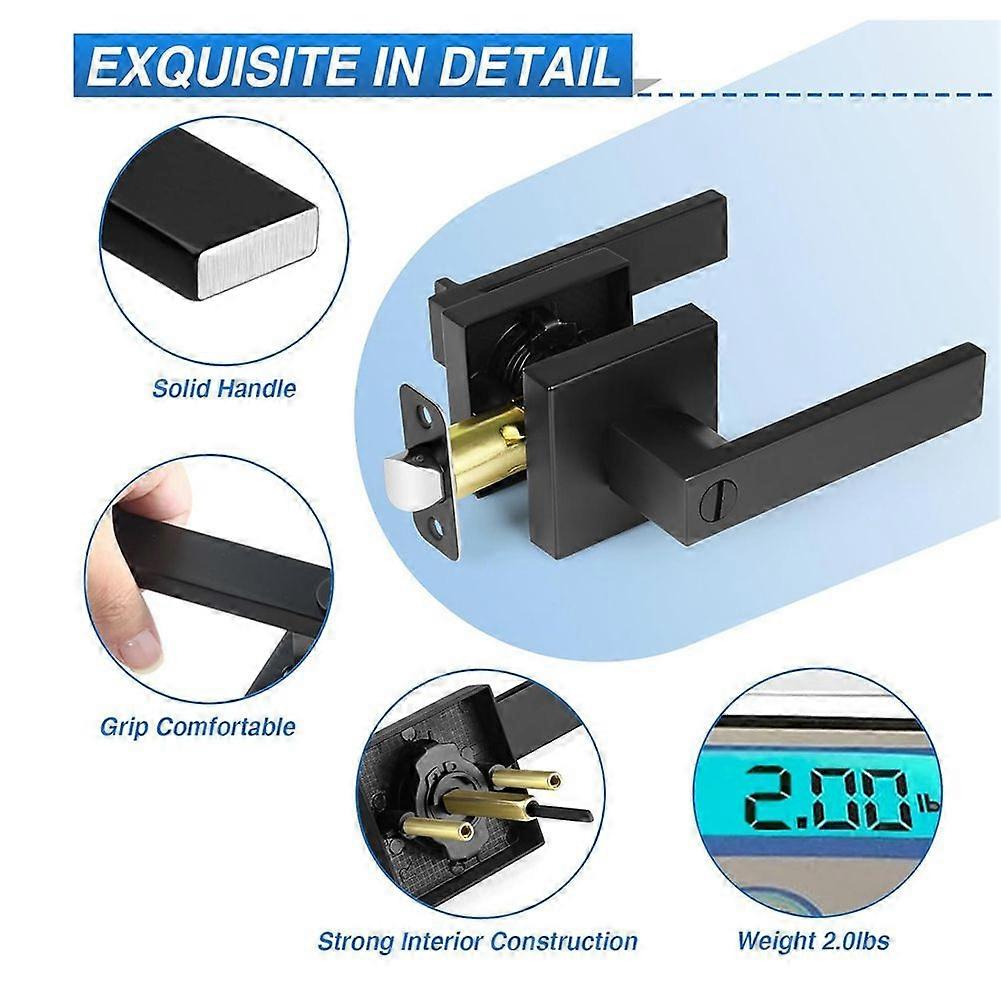 VERSION UPGRADING: The of our door handles adopts electroplating process instead of the powder coated or painted of other products, which has more adhesion for long-lasting product life. Square door handles feature a minimalist line design and a matte black to suit most home decor styles. It also gives you a smooth touch and enhances the beauty of your room. PREMIUM MATERIAL: Heavy-duty door handle is made of premium quality Aluminum Alloy and brass parts to rust-free in a high humidity environment. The thickened solid handle combined with high-quality materials is extra . EASY INSTALLATION: No need for professional door fitters, you just only need a screwdriver to quickly complete the installation! PRIVACY FUNCTION: The privacy door lock can be locked by twisting the button inside and opened outside in emergency WITHOUT keys(use a coin or screwdriver). Interior door handle provides excellent security and privacy and is commonly used in areas such as guest rooms, bedrooms, bathrooms, interior locking doors and other privacy needs. ADJUSTABLE LATCH: Black door knob has an adjustable universal latch, 2-3/8Inch (60mm) or 2-3/4Inch (70mm). This door lever fits 1-3/8Inch (35mm) to 1-3/4Inch (45mm) doors. Dimensions: Lever Length: 4.84Inch (123mm), Rosette Diameter: 2.4Inch (61mm) (Notice: The latch plate is unremovable) Colour:Black Material:Aluminum Alloy Package Contents: 3 * Door Handles Only the above package content, other products are not included. Note: Light reflection and different displays may cause the color of the item in the picture a little different from the real thing. The measurement allowed error is +/- 1-3cm.