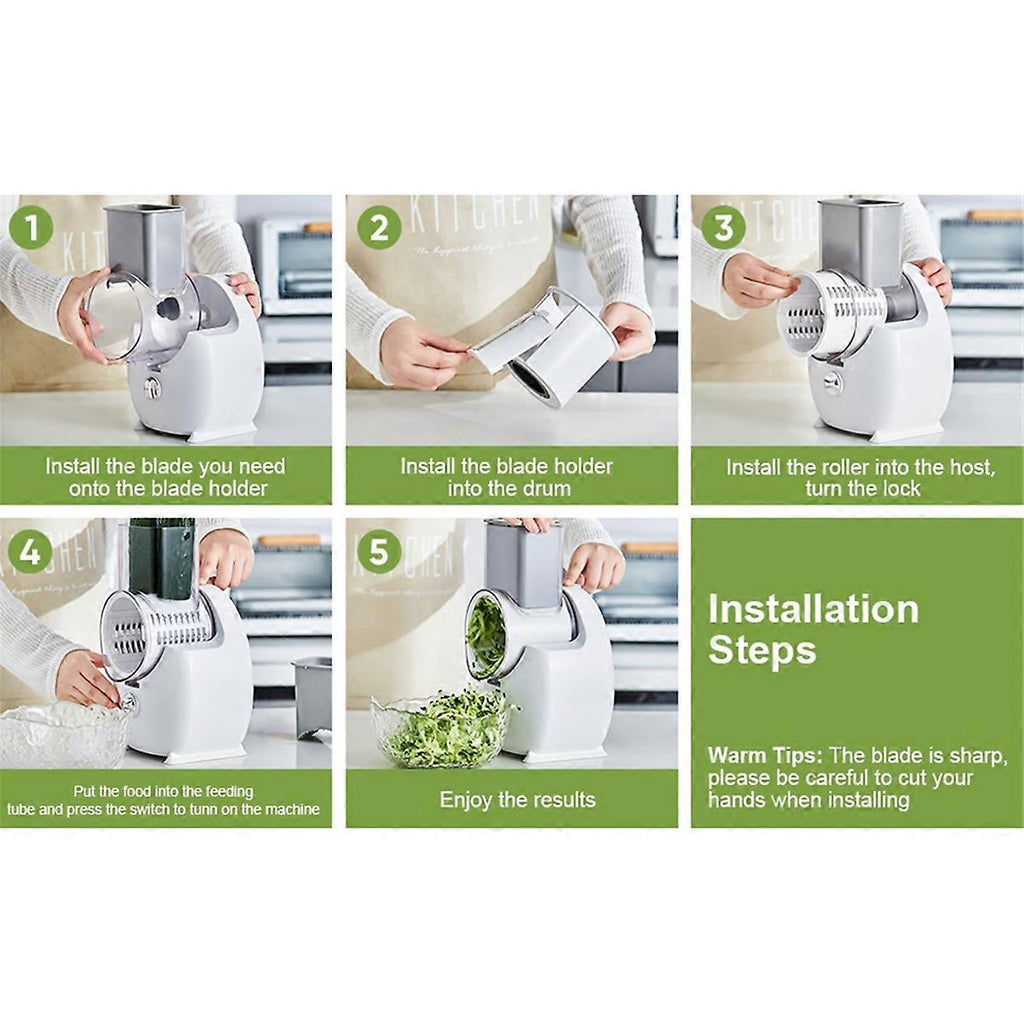 Efficient Grating Solution: Say goodbye to manual grating with our Electric Cheese Grater. Its powerful and efficient operation ensures quick and effortless grating of cheese, vegetables and nuts, saving you significant time and effort in the kitchen. Perfect for those late-night cooking adventures or quick meal preparations. Tailor Your Taste: With our versatile Electric Cheese Grater, you have the choice between fine, medium or coarse grating modes. This means you can customise your food textures according to , allowing for an elevated dining experience. Enjoy a variety of textures and on your dinner table. Consistent Results Every Time: Equipped with a robust motor and sharply-edged , our Electric Cheese Grater delivers uniform and consistent grating for all your culinary needs. Whether you're preparing pasta or salad, trust our grater to provide the perfect texture for your ingredients and dishes. User-Friendly Design, with Easy Clean-Up: This Electric Cheese Grater is designed with simplicity and convenience in mind. It features an easy-to-use on/off switch and comes with a detachable grating d that makes clean-up a breeze. No more stressful clean-ups after your cooking sessions! Safety and Guaranteed: We have prioritised safety and durability while designing this Electric Cheese Grater. It includes a secure locking system and is constructed from high-quality, materials, ensuring long-lasting performance and reliability in your kitchen. With our grater, trust that you're investing in a safe and kitchen appliance. model: Rechargeable model Material: Plastic + stainless steel colour: White Package Contents: 1 x Electric Grater 3 x Blade 1 x Charging Cable Only the above package content, other products are not included. Note: Light reflection and different displays may cause the color of the item in the picture a little different from the real thing. The measurement allowed error is +/- 1-3cm.