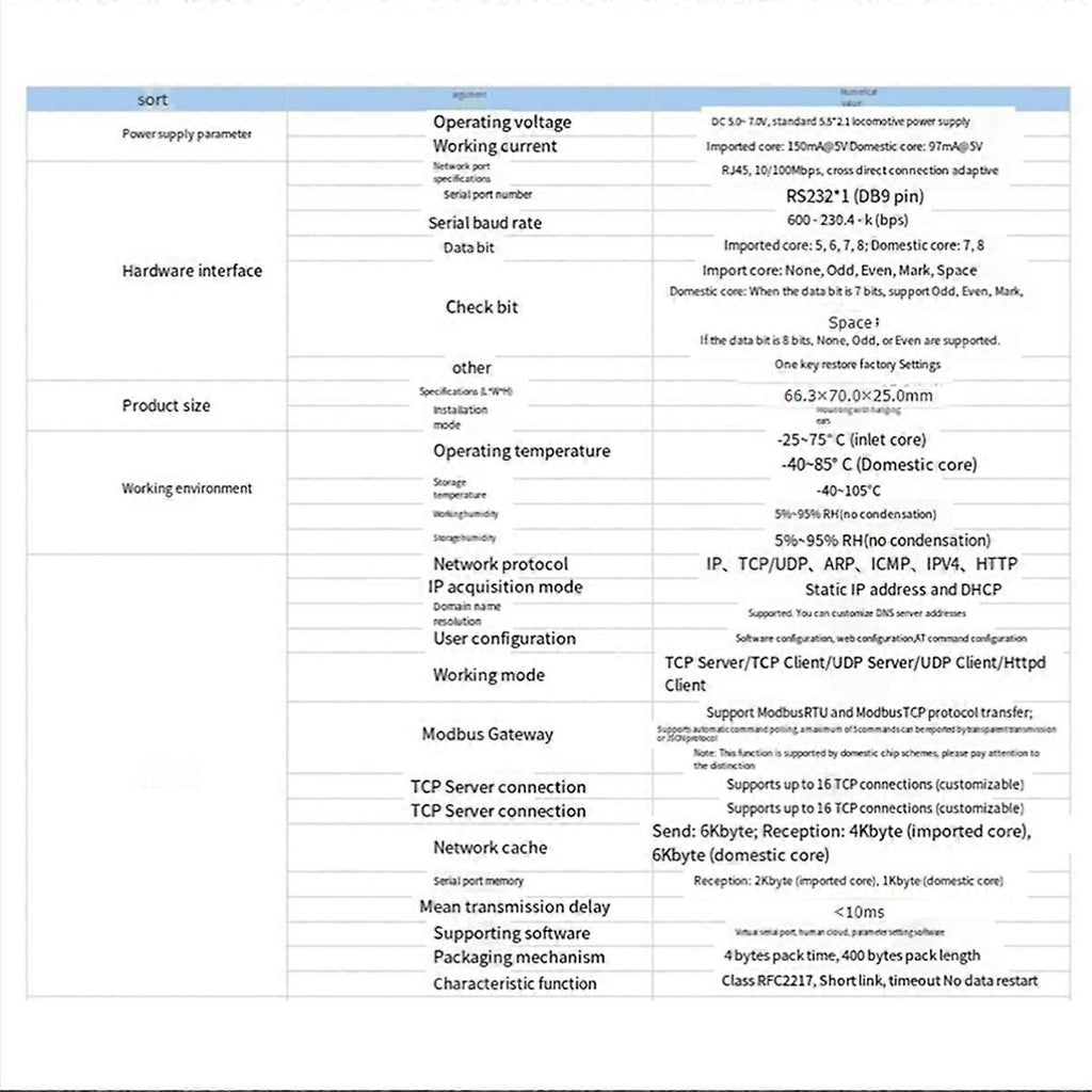 Support DHCP, automatically obtain an IP address and query IP address through serial protocol setting DNS support function Set the parameters through the web page Firmware update via Auto- / MDIX, RJ45 port with 10/100 Mbps Serial port baud rate from 600 to 230.4 Kbps, Control bits of None, Odd, Even, Mark and Space Working modes: Server, Client, UDP Client, UDP Server, HTTPD Client Support virtual serial port and provide corresponding - software Heartbeat package mechanism to the connection is reliable, put an end to dead link User-defined package registration mechanism, check connection status and use as the packet header In Server mode, Client number ranges from 1 to 16; default number is 4 The global unique address bought from IEEE, the user can define address Factory default reset Through the gateway, switch, router Can work in LAN, also can work in internet (external network) Provide PC / IP programming test socket such as VB, C ++, , Android and IOS Support customization Industrial data mission, industrial automation Safety and security monitoring, public safety Smart home, power control, environmental monitoring, smart agriculture Control door at work attendance system, POS system, rice sales system Building automation system, power control, self-service banking system, telecommunications monitoring machine room Colour: black Material: metal Package Contents: 1 * rs232 to Ethernet converter Only the above package content, other products are not included. Note: Light reflection and different displays may cause the color of the item in the picture a little different from the real thing. The measurement allowed error is +/- 1-3cm.