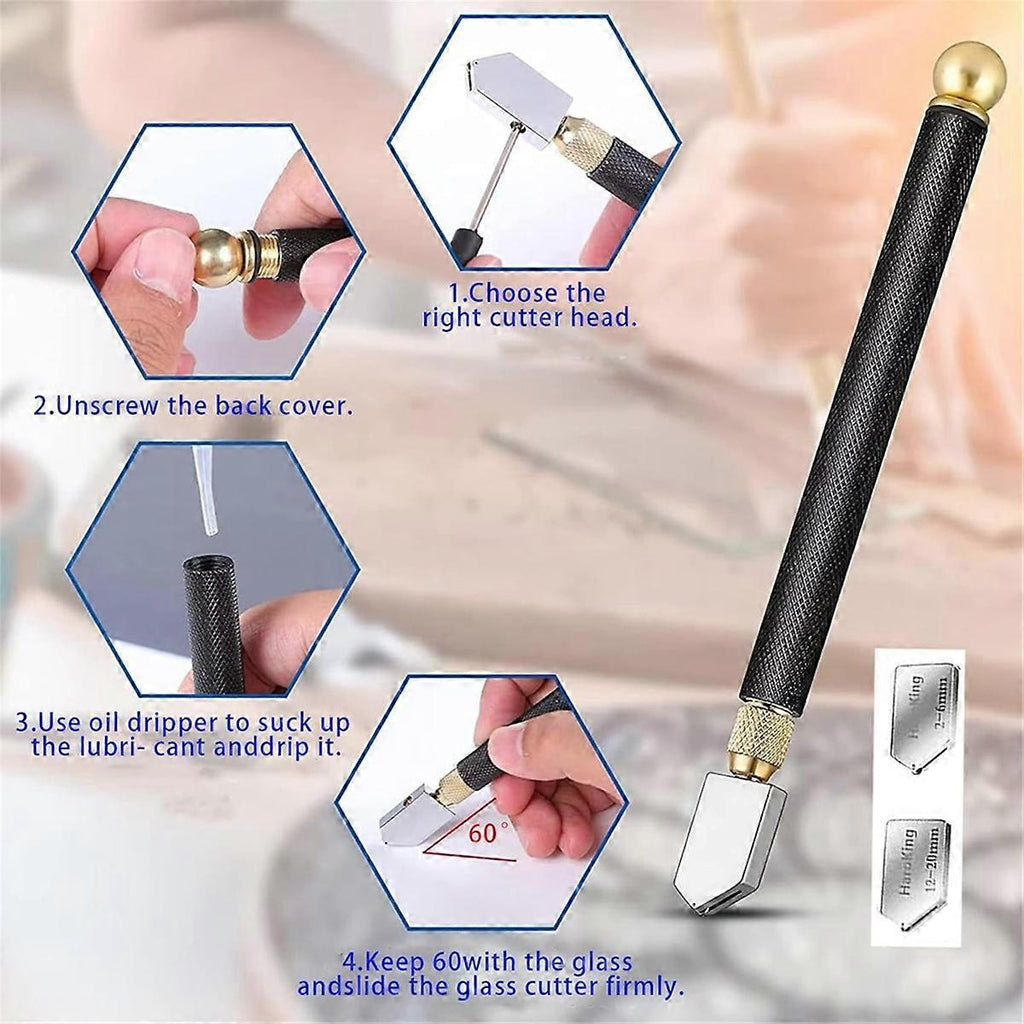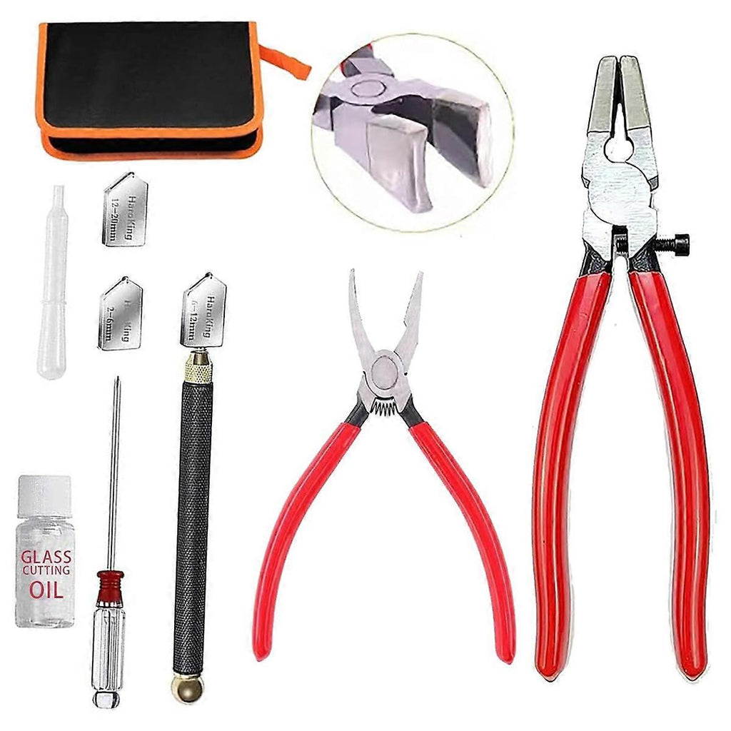 [All Glass Cutting Tools]In this glass cutters tools kit includes 1Pcs glass cutter ,2Pcs replacement (cutter head) 1Pcs 8 inch glass running plier , 1Pcs 6 inch glass breaking plier , 1Pcs glass cuting oil , 1Pcs oil dropper , 1Pcs screwdriver , 1Pcs leather zipper bag,you can change the cutting blade for cutting different glass thickness . [High Quality And Durability ]This roller glass cutter is from high-quality alloy, glass Cutter 2mm-20mm, glass cutting tool can filled with glass cutting oil,handle is made of anti slip aluminum alloy,glass cutter tool is suitable for different glass types, ideal glass cutter for mirrors, DIY, mosaic, tiles, stained glass cutting and household cutting work. [Comfortable Construction] Adjustable set screw design allows you to control the clamping force right and sizes, molded handle conforms to ergonomic design, providing a comfortable and grip. Heavy duty pliers tool not only work best on straight cuts, but also do well on gentle curves too. [Heavy Duty Breaker Grozer Pliers ] Glass breaking plier with recise parallel groove, breaking plier with aspring-loaded iaws,glass breaking pliers have soft red pvc cushioned handle makes you cutting glass work become relaxed. [Good Working Partner]Glass cutter and tile nippers allow for precise and clean cuts on different materials, with the glass cutter cutting smoothly and smoothly. The operating pliers clamp serves as a , and pressure is evenly applied on both sides of , quickly and completely separating.Suitable for cutting stained glass, mosaic tiles, ceramic tiles, mirrors, and stone after cutting in home decoration. Colour:As shown Material:Metal Package Contents: 1 * Glass Cutter kit Only the above package content, other products are not included. Note: Light reflection and different displays may cause the color of the item in the picture a little different from the real thing. The measurement allowed error is +/- 1-3cm.