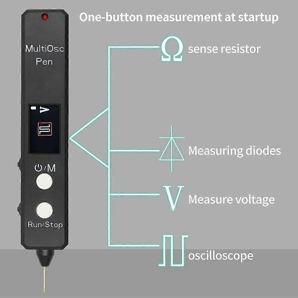 1. This product is a multifunctional tester with built-in high-precision voltmeter + resistance measuring inst ent + diode tester + oscilloscope. 2. Pen design, easy to use, easy to carry 3. This product can be mainly used in some quick maintenance scenarios 1. Oscilloscope: Frequency measure Accuracy:+/-1% Max One-key AUTO display waveform Sampling Rate:2MSa/s 400KHz Bandwidth Storage depth:4Kbit Trigger mode:Auto Trigger edge:Falling edge Coupling mode:DC Maximum test voltage:24V Vertical sensitivity:50 mV/-10 V/ Horizontal time base range:10us/-200ms/ 2. Voltage measure: Measure Accuracy:+/-1.5% or +/-0.15V Max Maximum Input - Voltage:24V Minimum Resolution:0.1V Voltage Alarm 3. Resistance measure Measure range:10Q-5M Measure Accuracy:+/-2% 4. Diode measure 5. On-Off measure 6. Other paremeters: 1.14inch 135x240 TFT Rechargeable Battery Product Size:160x27x26mm Power port:USB Type-C 5V/1A Operate humidity:less than equal 80% Operate temperature:0-50 Due to different batches, there may be differences in product appearance, color, and printed text, which not affect the use. Colour:Black Material:ABS Package Contents: 1 x Multifunctional tester 1 x Test attachment 1 x charging cable Only the above package content, other products are not included. Note: Light reflection and different displays may cause the color of the item in the picture a little different from the real thing. The measurement allowed error is +/- 1-3cm.