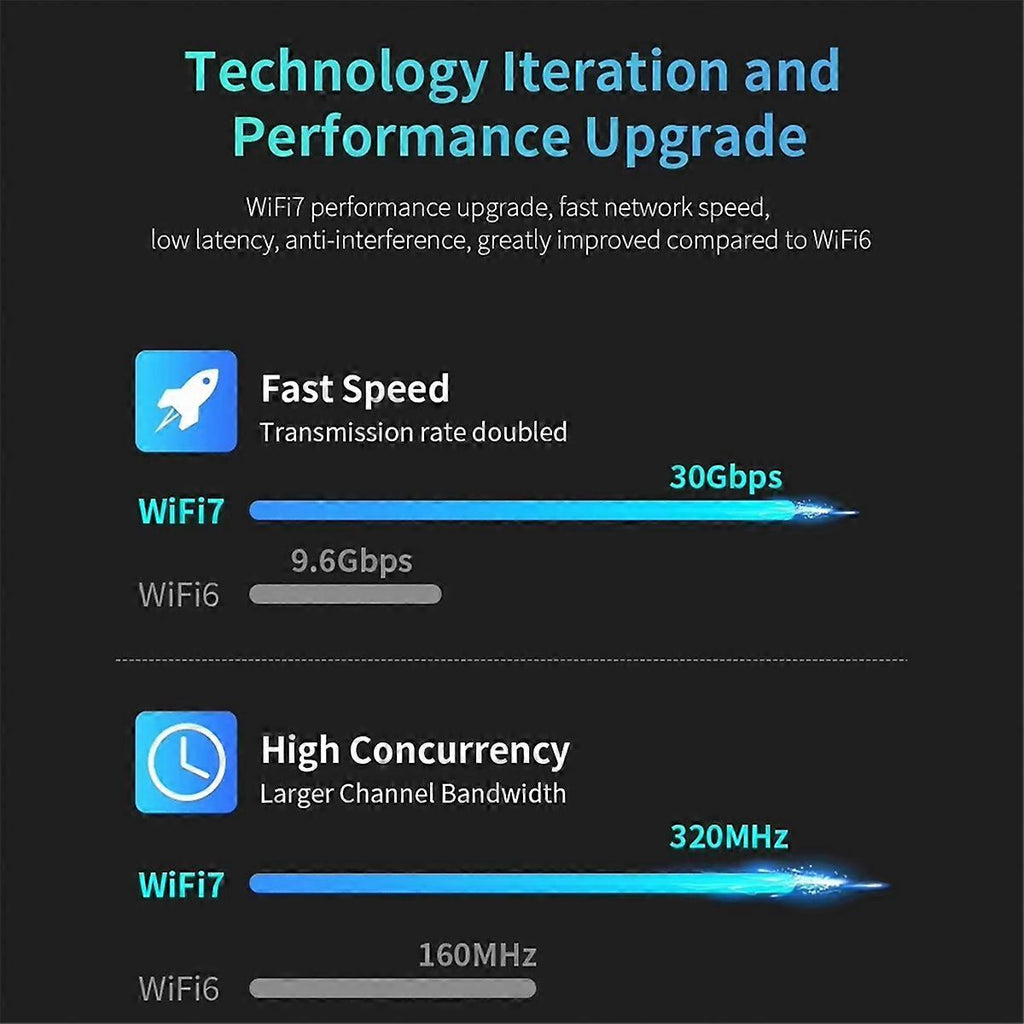 BE6500 WiFi7 dual-antenna driverless wireless card with automatic driver installation; 6500Mbps high-speed rate, supporting 2.4&5&6GHz tri-band; dual-antenna design, signal through the wall to improve the ability; WiFi7 technology, network latency, channel interference is greatly reduced, you can enjoy a smooth gaming experience in a highly congested environment to meet the user's high-end network requirements! BE6500 Wifi 7 Usb Adapter Interface Support: USB3.0 Chipset:RTL8912AU mit Power: 128mW (21dBm) ; Standards: IEEE802.11a/b/g/ac/ax/be Antenna: With 2x4dBi high gain antennas Applicable scope: Desktop/Laptop Frequency range: 2.4GHz+5GHz+6GHz mission Rate: 5374Mbps (2.4Ghz:688Mbps, 5.8Ghz:2882Mbps , 6Ghz: 2882Mbps) Encryption: WPA-/WPA2-,WPA/WPA2/WPA3 Support system: 10 (32 bits , 64 bits ) / 11 (64 bits ) ; Working Environment: Operating Temperature: 0C-40C Storage Temperature: -40C-70C Operating Humidity: 10%-90%RH No-condensing Storage Humidity: 5%-90%RH No-condensing Note: It needs to be used with a tri-band router higher than 6452Mbps so that card can reach its highest speed. Due to different batches, there may be differences in product appearance, color, and printed text, which not affect the use. Colour:Black Material:plastic Size:87.5mmx30mmx12.5mm Package Contents: 1 x WiFi Adapter Only the above package content, other products are not included. Note: Light reflection and different displays may cause the color of the item in the picture a little different from the real thing. The measurement allowed error is +/- 1-3cm.