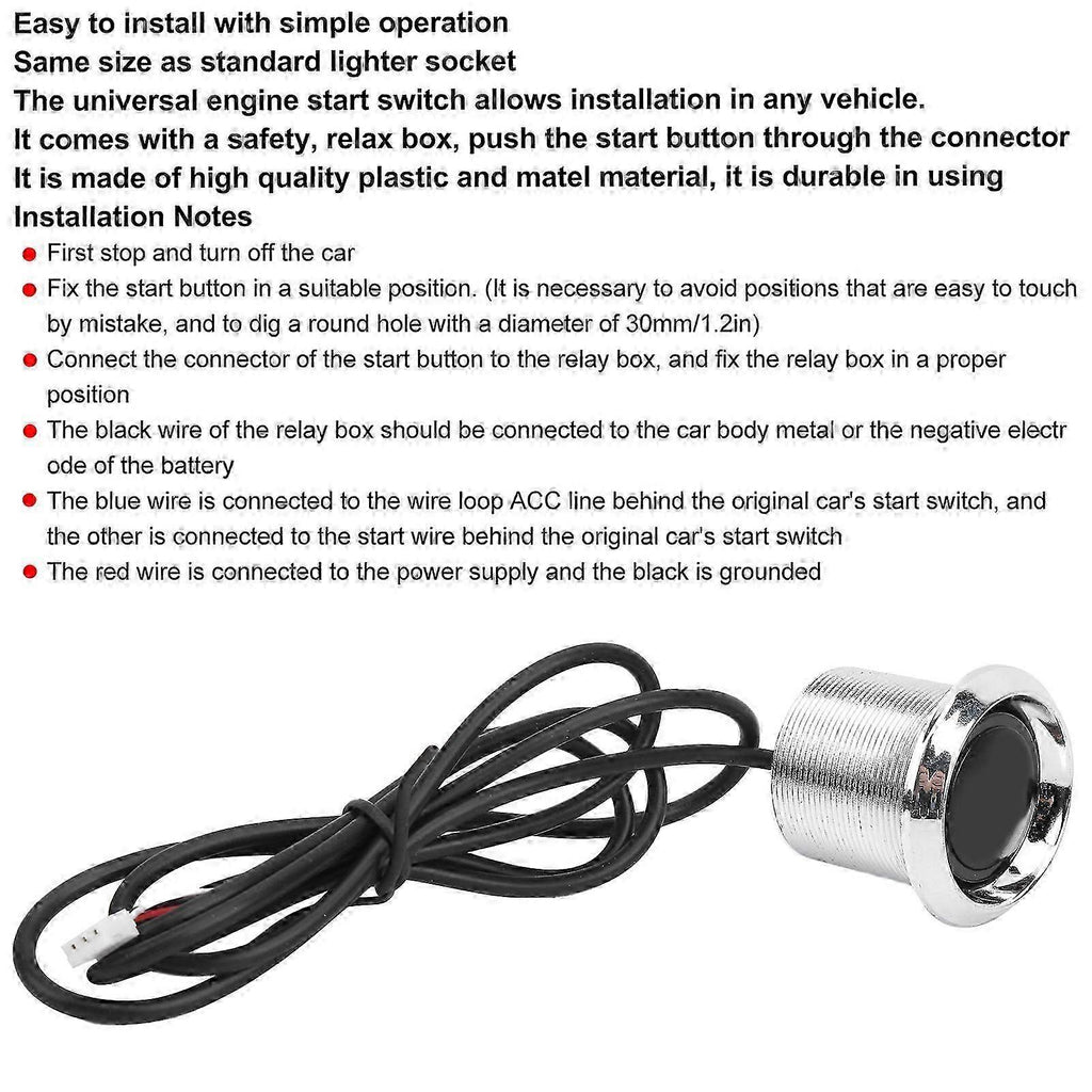 Features: 1.Made of high quality material, easy to install, no complicated tools required with simple operation. 2.Small and portable, same size as standard lighter socket, keyless start system. 3.Wide application, universal engine start switch kit allows installation in any any vehicle. 4.It comes with a safety, relax box, push the start button through the connector. 5.Made of high?quality plastic and frosted materials, which makes it durable and has a long service time. Specification: Item Type: Engine Start Switch_x000D_ Material: Plastic+Alloy_x000D_ Color: As Picture Shown_x000D_ Loop Diameter: Approx. 3.7cm/1.46in_x000D_ Hole Inner Diameter: Approx. 3.0cm/1.18in_x000D_ Weight: Approx. 149.0g/5.3oz_x000D_ DC: 12 V_x000D_ Installation Notes_x000D_ _x000D_ 1. First stop and turn off the car_x000D_ 2. Fix the start button in a suitable position. (It is necessary to avoid positions that are easy to touch by mistake, and to dig a round hole with a diameter of 30mm/1.2in)_x000D_ 3. Connect the connector of the start button to the relay box, and fix the relay box in a proper position._x000D_ 4. The black wire of the relay box should be connected to the car body metal or the negative electrode of the battery._x000D_ 5. The blue wire is connected to the wire loop ACC line behind the original car's start switch, and the other is connected to the start wire behind the original car's start switch._x000D_ 6. The red wire is connected to the power supply and the black is grounded. PackageList: 1 x Start Button1 x Relay2 x Install Loop2 x Screw2 x Manual1 x Tape1 x Nut Note: Do not press the start button again when the engine is running to avoid malfunction of the starting device