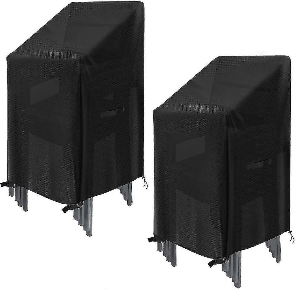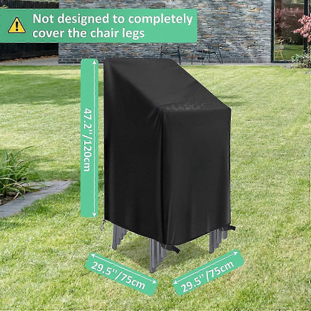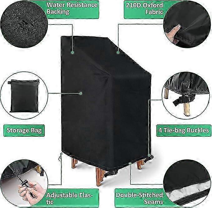 QUALITY MATERIAL: The chair cover is made of 210D Oxford fabric and has a waterproof coating. It can be used as a water repellent cover for garden chairs, stacking chairs, patio chairs, etc. It can also effectively protect the chairs from wear, ultraviolet rays, heat reflection and other external factors (such as rain, snow and dust). SIZE - PERFECT COMPATIBILITY: The size of the waterproof chair cover is 75*75*120cm, suitable for outdoor furniture, such as stacking chairs, garden chairs with armrests, balcony chairs or patio chairs, etc. GARDEN FURNITURE COVER: The garden chair protective cover has internal stitching to improve strength, high-density stitching to improve durability, stretch lace makes the appearance more beautiful, and has strong tear resistance. ADJUSTABLE BUCKLE AND STRETCH LACE: The outdoor chair cover is equipped with 4 adjustable buckles and stretch lace. You can adjust the tightness by shrinking it according to the size of the chair. These can be fixed separately on the chair legs to ensure that the chair cover does not easily fall off the chair when the wind blows, which not only effectively protects the furniture, but also does not damage the furniture. .