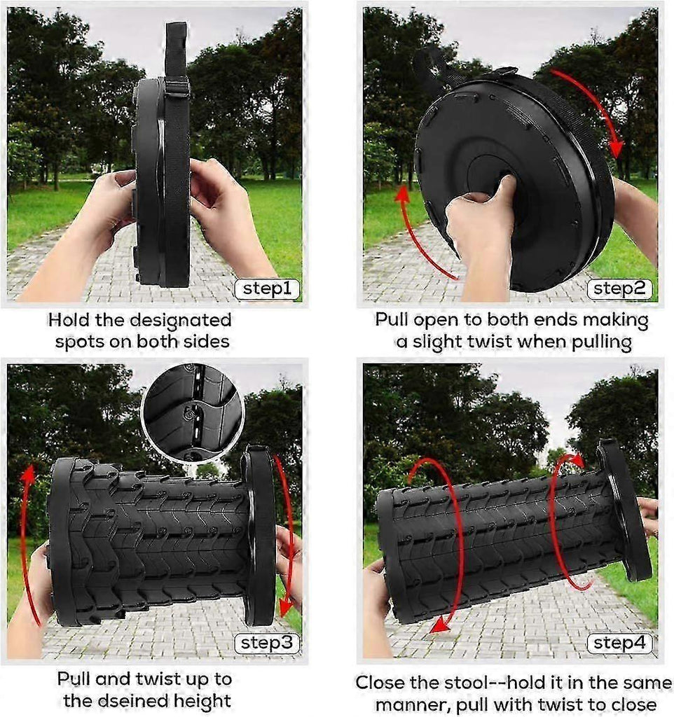 Durable,Sturdy,Stable,2023 Upgrade Patented Design: :Fish scale structure reinforced clasp for more sturdy and stable,the stool is made of 100 segments,and each layer has multiple buckles for safety,sturdy,durability,stability,comfortable,resistance and safer than old versions,the load capacity is 400lbs. Foldable,Adjustable height : :The folding Camping stool to open and close easily in just seconds, lock in place with slight rotation, easy installation. The height can be adjusted freely between approximately 2.4 inch and 18 inch,It applicable for adults with less than 400lb weight,it is perfect for sending as a gift for family,friends,relatives. Portable,Lightweight: :Diameter and height in the closed state are 10" and 2.4" of this retractable stool, weight is 2.54 lbs. You can carry it in your hand or hanging on your shoulder with the adjustable two straps without any burden.The retractable stool is portable, lightweight, small and convenient to place into luggage. Easy to use,Multipurpose: :super easy to use. You can open it by holding both ends and pulling to open with slight turning them,perfect for indoors and outdoors. Indoor occasions such as the living room, bedroom, bathroom, kitchen,office.Outdoor activities: drawing room,garden,hiking,BBQ,camping,queue,fishing, kitchen, etc. Self-open Prevention: :When this fold up stool is closed, snap joints designed on the caps come into play to prevent stool opening by itself. This make it more convenient and easier to bring it along for outdoor activities,the non-slip base ensure that this collapsable stool will give the stability to provide safe and comfortable sitting.